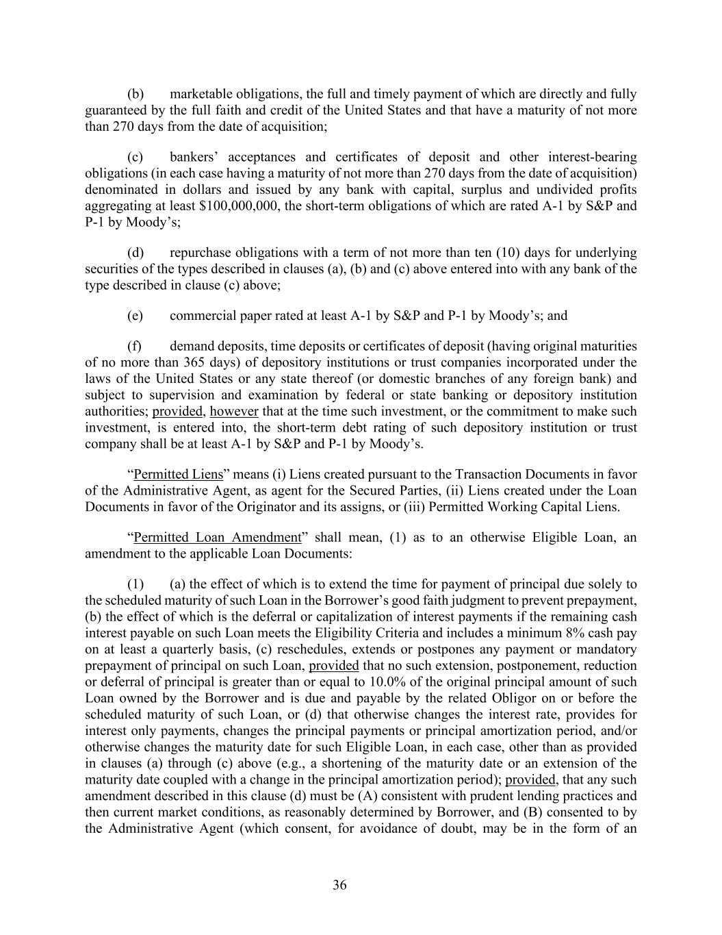 36 (b) marketable obligations, the full and timely payment of which are directly and fully guaranteed by the full faith and credit of the United States and that have a maturity of not more than 270 days from the date of acquisition; (c) bankers’ acceptances and certificates of deposit and other interest-bearing obligations (in each case having a maturity of not more than 270 days from the date of acquisition) denominated in dollars and issued by any bank with capital, surplus and undivided profits aggregating at least $100,000,000, the short-term obligations of which are rated A-1 by S&P and P-1 by Moody’s; (d) repurchase obligations with a term of not more than ten (10) days for underlying securities of the types described in clauses (a), (b) and (c) above entered into with any bank of the type described in clause (c) above; (e) commercial paper rated at least A-1 by S&P and P-1 by Moody’s; and (f) demand deposits, time deposits or certificates of deposit (having original maturities of no more than 365 days) of depository institutions or trust companies incorporated under the laws of the United States or any state thereof (or domestic branches of any foreign bank) and subject to supervision and examination by federal or state banking or depository institution authorities; provided, however that at the time such investment, or the commitment to make such investment, is entered into, the short-term debt rating of such depository institution or trust company shall be at least A-1 by S&P and P-1 by Moody’s. “Permitted Liens” means (i) Liens created pursuant to the Transaction Documents in favor of the Administrative Agent, as agent for the Secured Parties, (ii) Liens created under the Loan Documents in favor of the Originator and its assigns, or (iii) Permitted Working Capital Liens. “Permitted Loan Amendment” shall mean, (1) as to an otherwise Eligible Loan, an amendment to the applicable Loan Documents: (1) (a) the effect of which is to extend the time for payment of principal due solely to the scheduled maturity of such Loan in the Borrower’s good faith judgment to prevent prepayment, (b) the effect of which is the deferral or capitalization of interest payments if the remaining cash interest payable on such Loan meets the Eligibility Criteria and includes a minimum 8% cash pay on at least a quarterly basis, (c) reschedules, extends or postpones any payment or mandatory prepayment of principal on such Loan, provided that no such extension, postponement, reduction or deferral of principal is greater than or equal to 10.0% of the original principal amount of such Loan owned by the Borrower and is due and payable by the related Obligor on or before the scheduled maturity of such Loan, or (d) that otherwise changes the interest rate, provides for interest only payments, changes the principal payments or principal amortization period, and/or otherwise changes the maturity date for such Eligible Loan, in each case, other than as provided in clauses (a) through (c) above (e.g., a shortening of the maturity date or an extension of the maturity date coupled with a change in the principal amortization period); provided, that any such amendment described in this clause (d) must be (A) consistent with prudent lending practices and then current market conditions, as reasonably determined by Borrower, and (B) consented to by the Administrative Agent (which consent, for avoidance of doubt, may be in the form of an