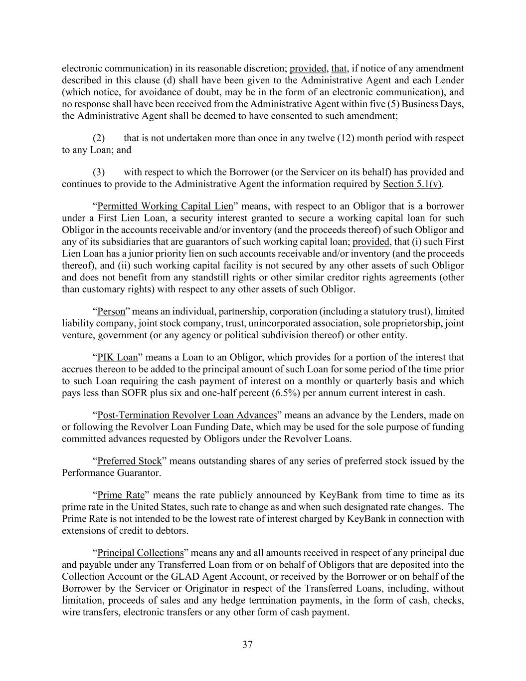 37 electronic communication) in its reasonable discretion; provided, that, if notice of any amendment described in this clause (d) shall have been given to the Administrative Agent and each Lender (which notice, for avoidance of doubt, may be in the form of an electronic communication), and no response shall have been received from the Administrative Agent within five (5) Business Days, the Administrative Agent shall be deemed to have consented to such amendment; (2) that is not undertaken more than once in any twelve (12) month period with respect to any Loan; and (3) with respect to which the Borrower (or the Servicer on its behalf) has provided and continues to provide to the Administrative Agent the information required by Section 5.1(v). “Permitted Working Capital Lien” means, with respect to an Obligor that is a borrower under a First Lien Loan, a security interest granted to secure a working capital loan for such Obligor in the accounts receivable and/or inventory (and the proceeds thereof) of such Obligor and any of its subsidiaries that are guarantors of such working capital loan; provided, that (i) such First Lien Loan has a junior priority lien on such accounts receivable and/or inventory (and the proceeds thereof), and (ii) such working capital facility is not secured by any other assets of such Obligor and does not benefit from any standstill rights or other similar creditor rights agreements (other than customary rights) with respect to any other assets of such Obligor. “Person” means an individual, partnership, corporation (including a statutory trust), limited liability company, joint stock company, trust, unincorporated association, sole proprietorship, joint venture, government (or any agency or political subdivision thereof) or other entity. “PIK Loan” means a Loan to an Obligor, which provides for a portion of the interest that accrues thereon to be added to the principal amount of such Loan for some period of the time prior to such Loan requiring the cash payment of interest on a monthly or quarterly basis and which pays less than SOFR plus six and one-half percent (6.5%) per annum current interest in cash. “Post-Termination Revolver Loan Advances” means an advance by the Lenders, made on or following the Revolver Loan Funding Date, which may be used for the sole purpose of funding committed advances requested by Obligors under the Revolver Loans. “Preferred Stock” means outstanding shares of any series of preferred stock issued by the Performance Guarantor. “Prime Rate” means the rate publicly announced by KeyBank from time to time as its prime rate in the United States, such rate to change as and when such designated rate changes. The Prime Rate is not intended to be the lowest rate of interest charged by KeyBank in connection with extensions of credit to debtors. “Principal Collections” means any and all amounts received in respect of any principal due and payable under any Transferred Loan from or on behalf of Obligors that are deposited into the Collection Account or the GLAD Agent Account, or received by the Borrower or on behalf of the Borrower by the Servicer or Originator in respect of the Transferred Loans, including, without limitation, proceeds of sales and any hedge termination payments, in the form of cash, checks, wire transfers, electronic transfers or any other form of cash payment.