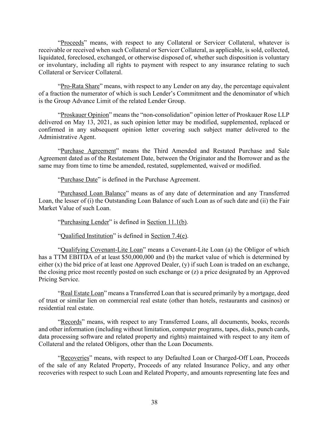 38 “Proceeds” means, with respect to any Collateral or Servicer Collateral, whatever is receivable or received when such Collateral or Servicer Collateral, as applicable, is sold, collected, liquidated, foreclosed, exchanged, or otherwise disposed of, whether such disposition is voluntary or involuntary, including all rights to payment with respect to any insurance relating to such Collateral or Servicer Collateral. “Pro-Rata Share” means, with respect to any Lender on any day, the percentage equivalent of a fraction the numerator of which is such Lender’s Commitment and the denominator of which is the Group Advance Limit of the related Lender Group. “Proskauer Opinion” means the “non-consolidation” opinion letter of Proskauer Rose LLP delivered on May 13, 2021, as such opinion letter may be modified, supplemented, replaced or confirmed in any subsequent opinion letter covering such subject matter delivered to the Administrative Agent. “Purchase Agreement” means the Third Amended and Restated Purchase and Sale Agreement dated as of the Restatement Date, between the Originator and the Borrower and as the same may from time to time be amended, restated, supplemented, waived or modified. “Purchase Date” is defined in the Purchase Agreement. “Purchased Loan Balance” means as of any date of determination and any Transferred Loan, the lesser of (i) the Outstanding Loan Balance of such Loan as of such date and (ii) the Fair Market Value of such Loan. “Purchasing Lender” is defined in Section 11.1(b). “Qualified Institution” is defined in Section 7.4(e). “Qualifying Covenant-Lite Loan” means a Covenant-Lite Loan (a) the Obligor of which has a TTM EBITDA of at least $50,000,000 and (b) the market value of which is determined by either (x) the bid price of at least one Approved Dealer, (y) if such Loan is traded on an exchange, the closing price most recently posted on such exchange or (z) a price designated by an Approved Pricing Service. “Real Estate Loan” means a Transferred Loan that is secured primarily by a mortgage, deed of trust or similar lien on commercial real estate (other than hotels, restaurants and casinos) or residential real estate. “Records” means, with respect to any Transferred Loans, all documents, books, records and other information (including without limitation, computer programs, tapes, disks, punch cards, data processing software and related property and rights) maintained with respect to any item of Collateral and the related Obligors, other than the Loan Documents. “Recoveries” means, with respect to any Defaulted Loan or Charged-Off Loan, Proceeds of the sale of any Related Property, Proceeds of any related Insurance Policy, and any other recoveries with respect to such Loan and Related Property, and amounts representing late fees and