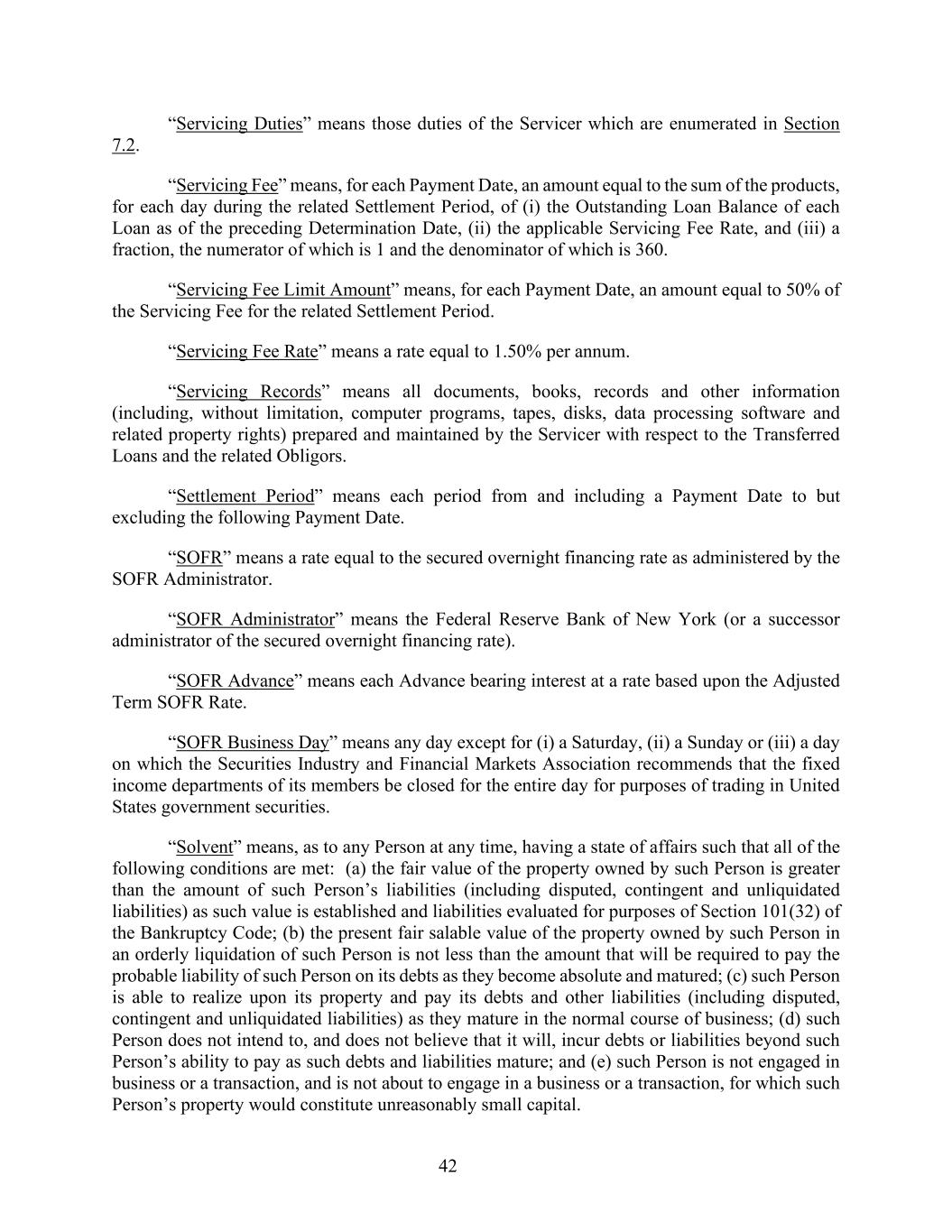 42 “Servicing Duties” means those duties of the Servicer which are enumerated in Section 7.2. “Servicing Fee” means, for each Payment Date, an amount equal to the sum of the products, for each day during the related Settlement Period, of (i) the Outstanding Loan Balance of each Loan as of the preceding Determination Date, (ii) the applicable Servicing Fee Rate, and (iii) a fraction, the numerator of which is 1 and the denominator of which is 360. “Servicing Fee Limit Amount” means, for each Payment Date, an amount equal to 50% of the Servicing Fee for the related Settlement Period. “Servicing Fee Rate” means a rate equal to 1.50% per annum. “Servicing Records” means all documents, books, records and other information (including, without limitation, computer programs, tapes, disks, data processing software and related property rights) prepared and maintained by the Servicer with respect to the Transferred Loans and the related Obligors. “Settlement Period” means each period from and including a Payment Date to but excluding the following Payment Date. “SOFR” means a rate equal to the secured overnight financing rate as administered by the SOFR Administrator. “SOFR Administrator” means the Federal Reserve Bank of New York (or a successor administrator of the secured overnight financing rate). “SOFR Advance” means each Advance bearing interest at a rate based upon the Adjusted Term SOFR Rate. “SOFR Business Day” means any day except for (i) a Saturday, (ii) a Sunday or (iii) a day on which the Securities Industry and Financial Markets Association recommends that the fixed income departments of its members be closed for the entire day for purposes of trading in United States government securities. “Solvent” means, as to any Person at any time, having a state of affairs such that all of the following conditions are met: (a) the fair value of the property owned by such Person is greater than the amount of such Person’s liabilities (including disputed, contingent and unliquidated liabilities) as such value is established and liabilities evaluated for purposes of Section 101(32) of the Bankruptcy Code; (b) the present fair salable value of the property owned by such Person in an orderly liquidation of such Person is not less than the amount that will be required to pay the probable liability of such Person on its debts as they become absolute and matured; (c) such Person is able to realize upon its property and pay its debts and other liabilities (including disputed, contingent and unliquidated liabilities) as they mature in the normal course of business; (d) such Person does not intend to, and does not believe that it will, incur debts or liabilities beyond such Person’s ability to pay as such debts and liabilities mature; and (e) such Person is not engaged in business or a transaction, and is not about to engage in a business or a transaction, for which such Person’s property would constitute unreasonably small capital.