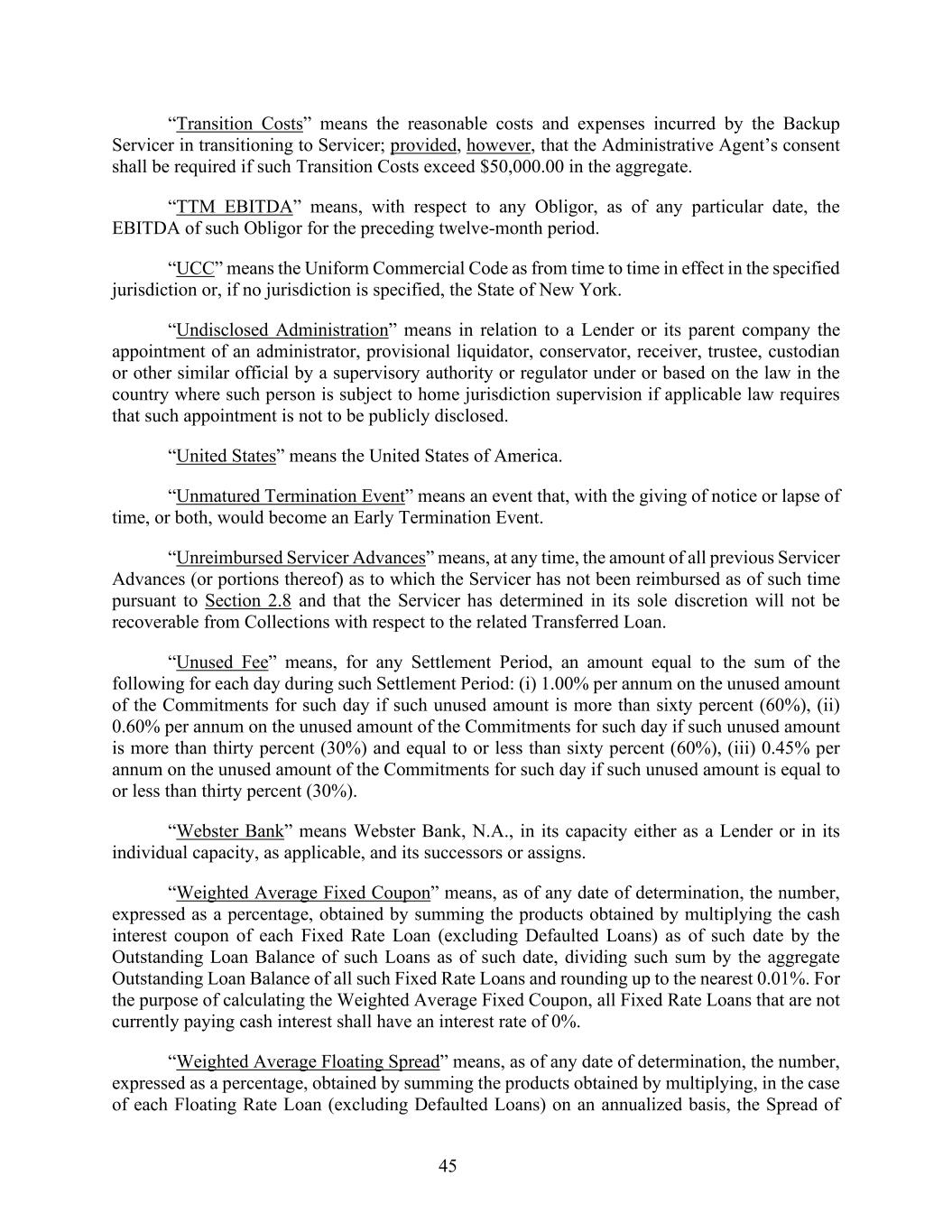 45 “Transition Costs” means the reasonable costs and expenses incurred by the Backup Servicer in transitioning to Servicer; provided, however, that the Administrative Agent’s consent shall be required if such Transition Costs exceed $50,000.00 in the aggregate. “TTM EBITDA” means, with respect to any Obligor, as of any particular date, the EBITDA of such Obligor for the preceding twelve-month period. “UCC” means the Uniform Commercial Code as from time to time in effect in the specified jurisdiction or, if no jurisdiction is specified, the State of New York. “Undisclosed Administration” means in relation to a Lender or its parent company the appointment of an administrator, provisional liquidator, conservator, receiver, trustee, custodian or other similar official by a supervisory authority or regulator under or based on the law in the country where such person is subject to home jurisdiction supervision if applicable law requires that such appointment is not to be publicly disclosed. “United States” means the United States of America. “Unmatured Termination Event” means an event that, with the giving of notice or lapse of time, or both, would become an Early Termination Event. “Unreimbursed Servicer Advances” means, at any time, the amount of all previous Servicer Advances (or portions thereof) as to which the Servicer has not been reimbursed as of such time pursuant to Section 2.8 and that the Servicer has determined in its sole discretion will not be recoverable from Collections with respect to the related Transferred Loan. “Unused Fee” means, for any Settlement Period, an amount equal to the sum of the following for each day during such Settlement Period: (i) 1.00% per annum on the unused amount of the Commitments for such day if such unused amount is more than sixty percent (60%), (ii) 0.60% per annum on the unused amount of the Commitments for such day if such unused amount is more than thirty percent (30%) and equal to or less than sixty percent (60%), (iii) 0.45% per annum on the unused amount of the Commitments for such day if such unused amount is equal to or less than thirty percent (30%). “Webster Bank” means Webster Bank, N.A., in its capacity either as a Lender or in its individual capacity, as applicable, and its successors or assigns. “Weighted Average Fixed Coupon” means, as of any date of determination, the number, expressed as a percentage, obtained by summing the products obtained by multiplying the cash interest coupon of each Fixed Rate Loan (excluding Defaulted Loans) as of such date by the Outstanding Loan Balance of such Loans as of such date, dividing such sum by the aggregate Outstanding Loan Balance of all such Fixed Rate Loans and rounding up to the nearest 0.01%. For the purpose of calculating the Weighted Average Fixed Coupon, all Fixed Rate Loans that are not currently paying cash interest shall have an interest rate of 0%. “Weighted Average Floating Spread” means, as of any date of determination, the number, expressed as a percentage, obtained by summing the products obtained by multiplying, in the case of each Floating Rate Loan (excluding Defaulted Loans) on an annualized basis, the Spread of