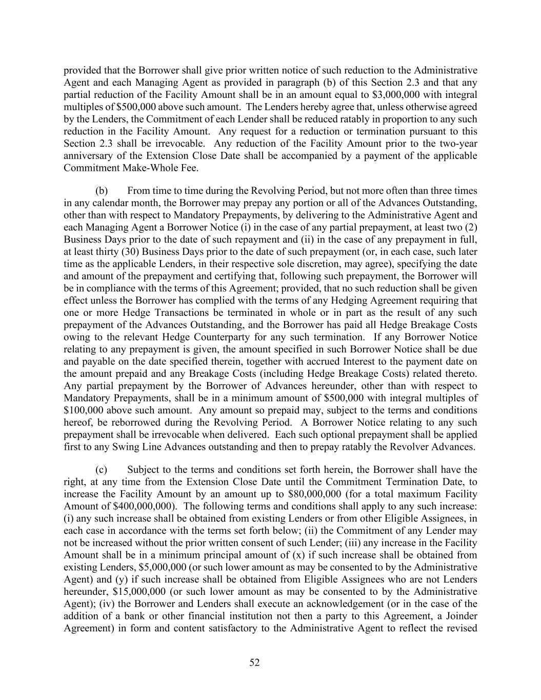 52 provided that the Borrower shall give prior written notice of such reduction to the Administrative Agent and each Managing Agent as provided in paragraph (b) of this Section 2.3 and that any partial reduction of the Facility Amount shall be in an amount equal to $3,000,000 with integral multiples of $500,000 above such amount. The Lenders hereby agree that, unless otherwise agreed by the Lenders, the Commitment of each Lender shall be reduced ratably in proportion to any such reduction in the Facility Amount. Any request for a reduction or termination pursuant to this Section 2.3 shall be irrevocable. Any reduction of the Facility Amount prior to the two-year anniversary of the Extension Close Date shall be accompanied by a payment of the applicable Commitment Make-Whole Fee. (b) From time to time during the Revolving Period, but not more often than three times in any calendar month, the Borrower may prepay any portion or all of the Advances Outstanding, other than with respect to Mandatory Prepayments, by delivering to the Administrative Agent and each Managing Agent a Borrower Notice (i) in the case of any partial prepayment, at least two (2) Business Days prior to the date of such repayment and (ii) in the case of any prepayment in full, at least thirty (30) Business Days prior to the date of such prepayment (or, in each case, such later time as the applicable Lenders, in their respective sole discretion, may agree), specifying the date and amount of the prepayment and certifying that, following such prepayment, the Borrower will be in compliance with the terms of this Agreement; provided, that no such reduction shall be given effect unless the Borrower has complied with the terms of any Hedging Agreement requiring that one or more Hedge Transactions be terminated in whole or in part as the result of any such prepayment of the Advances Outstanding, and the Borrower has paid all Hedge Breakage Costs owing to the relevant Hedge Counterparty for any such termination. If any Borrower Notice relating to any prepayment is given, the amount specified in such Borrower Notice shall be due and payable on the date specified therein, together with accrued Interest to the payment date on the amount prepaid and any Breakage Costs (including Hedge Breakage Costs) related thereto. Any partial prepayment by the Borrower of Advances hereunder, other than with respect to Mandatory Prepayments, shall be in a minimum amount of $500,000 with integral multiples of $100,000 above such amount. Any amount so prepaid may, subject to the terms and conditions hereof, be reborrowed during the Revolving Period. A Borrower Notice relating to any such prepayment shall be irrevocable when delivered. Each such optional prepayment shall be applied first to any Swing Line Advances outstanding and then to prepay ratably the Revolver Advances. (c) Subject to the terms and conditions set forth herein, the Borrower shall have the right, at any time from the Extension Close Date until the Commitment Termination Date, to increase the Facility Amount by an amount up to $80,000,000 (for a total maximum Facility Amount of $400,000,000). The following terms and conditions shall apply to any such increase: (i) any such increase shall be obtained from existing Lenders or from other Eligible Assignees, in each case in accordance with the terms set forth below; (ii) the Commitment of any Lender may not be increased without the prior written consent of such Lender; (iii) any increase in the Facility Amount shall be in a minimum principal amount of (x) if such increase shall be obtained from existing Lenders, $5,000,000 (or such lower amount as may be consented to by the Administrative Agent) and (y) if such increase shall be obtained from Eligible Assignees who are not Lenders hereunder, $15,000,000 (or such lower amount as may be consented to by the Administrative Agent); (iv) the Borrower and Lenders shall execute an acknowledgement (or in the case of the addition of a bank or other financial institution not then a party to this Agreement, a Joinder Agreement) in form and content satisfactory to the Administrative Agent to reflect the revised