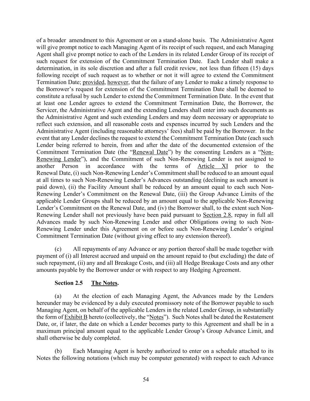54 of a broader amendment to this Agreement or on a stand-alone basis. The Administrative Agent will give prompt notice to each Managing Agent of its receipt of such request, and each Managing Agent shall give prompt notice to each of the Lenders in its related Lender Group of its receipt of such request for extension of the Commitment Termination Date. Each Lender shall make a determination, in its sole discretion and after a full credit review, not less than fifteen (15) days following receipt of such request as to whether or not it will agree to extend the Commitment Termination Date; provided, however, that the failure of any Lender to make a timely response to the Borrower’s request for extension of the Commitment Termination Date shall be deemed to constitute a refusal by such Lender to extend the Commitment Termination Date. In the event that at least one Lender agrees to extend the Commitment Termination Date, the Borrower, the Servicer, the Administrative Agent and the extending Lenders shall enter into such documents as the Administrative Agent and such extending Lenders and may deem necessary or appropriate to reflect such extension, and all reasonable costs and expenses incurred by such Lenders and the Administrative Agent (including reasonable attorneys’ fees) shall be paid by the Borrower. In the event that any Lender declines the request to extend the Commitment Termination Date (each such Lender being referred to herein, from and after the date of the documented extension of the Commitment Termination Date (the “Renewal Date”) by the consenting Lenders as a “Non- Renewing Lender”), and the Commitment of such Non-Renewing Lender is not assigned to another Person in accordance with the terms of Article XI prior to the Renewal Date, (i) such Non-Renewing Lender’s Commitment shall be reduced to an amount equal at all times to such Non-Renewing Lender’s Advances outstanding (declining as such amount is paid down), (ii) the Facility Amount shall be reduced by an amount equal to each such Non- Renewing Lender’s Commitment on the Renewal Date, (iii) the Group Advance Limits of the applicable Lender Groups shall be reduced by an amount equal to the applicable Non-Renewing Lender’s Commitment on the Renewal Date, and (iv) the Borrower shall, to the extent such Non- Renewing Lender shall not previously have been paid pursuant to Section 2.8, repay in full all Advances made by such Non-Renewing Lender and other Obligations owing to such Non- Renewing Lender under this Agreement on or before such Non-Renewing Lender’s original Commitment Termination Date (without giving effect to any extension thereof). (c) All repayments of any Advance or any portion thereof shall be made together with payment of (i) all Interest accrued and unpaid on the amount repaid to (but excluding) the date of such repayment, (ii) any and all Breakage Costs, and (iii) all Hedge Breakage Costs and any other amounts payable by the Borrower under or with respect to any Hedging Agreement. Section 2.5 The Notes. (a) At the election of each Managing Agent, the Advances made by the Lenders hereunder may be evidenced by a duly executed promissory note of the Borrower payable to such Managing Agent, on behalf of the applicable Lenders in the related Lender Group, in substantially the form of Exhibit B hereto (collectively, the “Notes”). Such Notes shall be dated the Restatement Date, or, if later, the date on which a Lender becomes party to this Agreement and shall be in a maximum principal amount equal to the applicable Lender Group’s Group Advance Limit, and shall otherwise be duly completed. (b) Each Managing Agent is hereby authorized to enter on a schedule attached to its Notes the following notations (which may be computer generated) with respect to each Advance