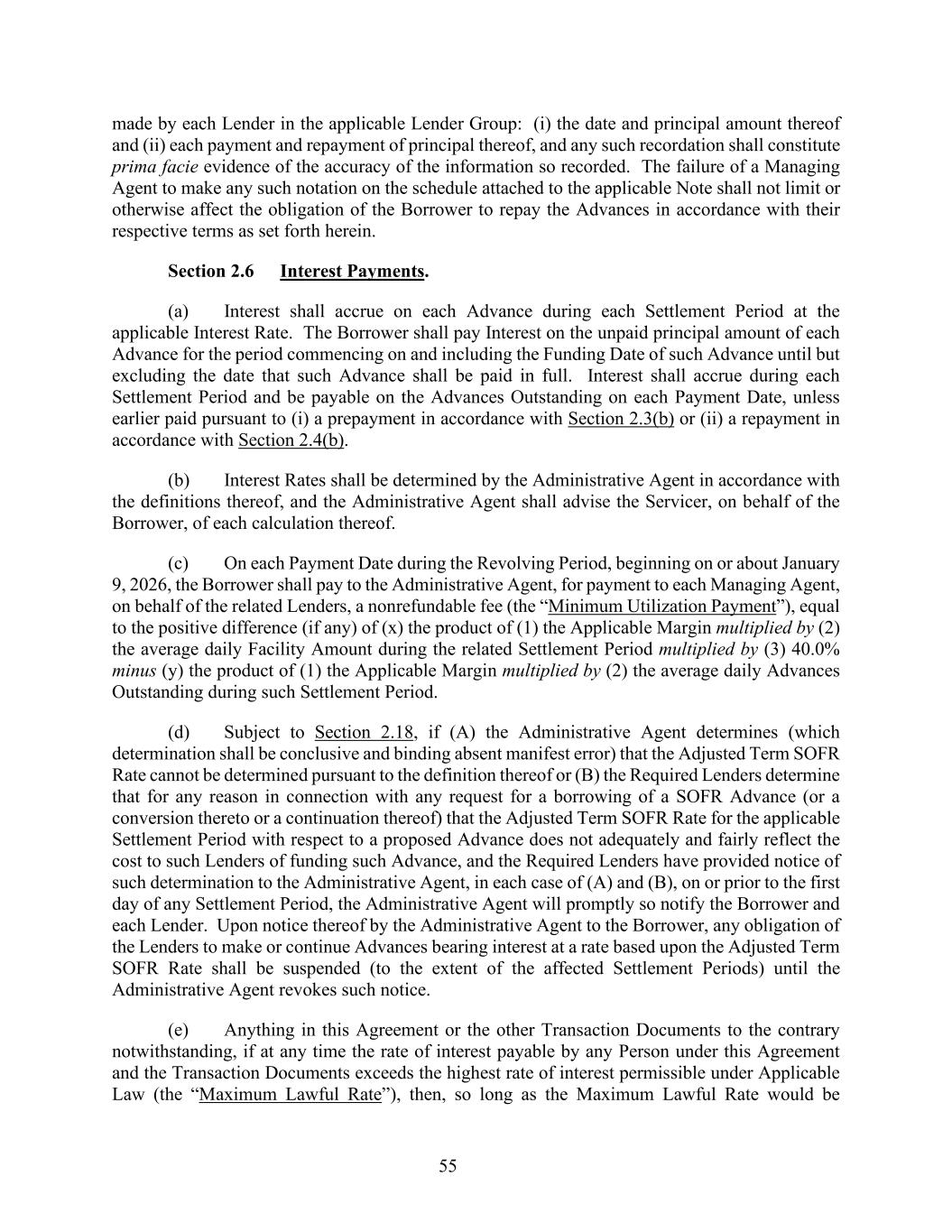 55 made by each Lender in the applicable Lender Group: (i) the date and principal amount thereof and (ii) each payment and repayment of principal thereof, and any such recordation shall constitute prima facie evidence of the accuracy of the information so recorded. The failure of a Managing Agent to make any such notation on the schedule attached to the applicable Note shall not limit or otherwise affect the obligation of the Borrower to repay the Advances in accordance with their respective terms as set forth herein. Section 2.6 Interest Payments. (a) Interest shall accrue on each Advance during each Settlement Period at the applicable Interest Rate. The Borrower shall pay Interest on the unpaid principal amount of each Advance for the period commencing on and including the Funding Date of such Advance until but excluding the date that such Advance shall be paid in full. Interest shall accrue during each Settlement Period and be payable on the Advances Outstanding on each Payment Date, unless earlier paid pursuant to (i) a prepayment in accordance with Section 2.3(b) or (ii) a repayment in accordance with Section 2.4(b). (b) Interest Rates shall be determined by the Administrative Agent in accordance with the definitions thereof, and the Administrative Agent shall advise the Servicer, on behalf of the Borrower, of each calculation thereof. (c) On each Payment Date during the Revolving Period, beginning on or about January 9, 2026, the Borrower shall pay to the Administrative Agent, for payment to each Managing Agent, on behalf of the related Lenders, a nonrefundable fee (the “Minimum Utilization Payment”), equal to the positive difference (if any) of (x) the product of (1) the Applicable Margin multiplied by (2) the average daily Facility Amount during the related Settlement Period multiplied by (3) 40.0% minus (y) the product of (1) the Applicable Margin multiplied by (2) the average daily Advances Outstanding during such Settlement Period. (d) Subject to Section 2.18, if (A) the Administrative Agent determines (which determination shall be conclusive and binding absent manifest error) that the Adjusted Term SOFR Rate cannot be determined pursuant to the definition thereof or (B) the Required Lenders determine that for any reason in connection with any request for a borrowing of a SOFR Advance (or a conversion thereto or a continuation thereof) that the Adjusted Term SOFR Rate for the applicable Settlement Period with respect to a proposed Advance does not adequately and fairly reflect the cost to such Lenders of funding such Advance, and the Required Lenders have provided notice of such determination to the Administrative Agent, in each case of (A) and (B), on or prior to the first day of any Settlement Period, the Administrative Agent will promptly so notify the Borrower and each Lender. Upon notice thereof by the Administrative Agent to the Borrower, any obligation of the Lenders to make or continue Advances bearing interest at a rate based upon the Adjusted Term SOFR Rate shall be suspended (to the extent of the affected Settlement Periods) until the Administrative Agent revokes such notice. (e) Anything in this Agreement or the other Transaction Documents to the contrary notwithstanding, if at any time the rate of interest payable by any Person under this Agreement and the Transaction Documents exceeds the highest rate of interest permissible under Applicable Law (the “Maximum Lawful Rate”), then, so long as the Maximum Lawful Rate would be