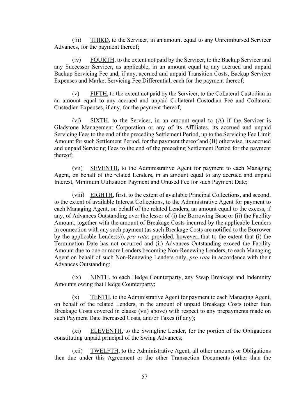 57 (iii) THIRD, to the Servicer, in an amount equal to any Unreimbursed Servicer Advances, for the payment thereof; (iv) FOURTH, to the extent not paid by the Servicer, to the Backup Servicer and any Successor Servicer, as applicable, in an amount equal to any accrued and unpaid Backup Servicing Fee and, if any, accrued and unpaid Transition Costs, Backup Servicer Expenses and Market Servicing Fee Differential, each for the payment thereof; (v) FIFTH, to the extent not paid by the Servicer, to the Collateral Custodian in an amount equal to any accrued and unpaid Collateral Custodian Fee and Collateral Custodian Expenses, if any, for the payment thereof; (vi) SIXTH, to the Servicer, in an amount equal to (A) if the Servicer is Gladstone Management Corporation or any of its Affiliates, its accrued and unpaid Servicing Fees to the end of the preceding Settlement Period, up to the Servicing Fee Limit Amount for such Settlement Period, for the payment thereof and (B) otherwise, its accrued and unpaid Servicing Fees to the end of the preceding Settlement Period for the payment thereof; (vii) SEVENTH, to the Administrative Agent for payment to each Managing Agent, on behalf of the related Lenders, in an amount equal to any accrued and unpaid Interest, Minimum Utilization Payment and Unused Fee for such Payment Date; (viii) EIGHTH, first, to the extent of available Principal Collections, and second, to the extent of available Interest Collections, to the Administrative Agent for payment to each Managing Agent, on behalf of the related Lenders, an amount equal to the excess, if any, of Advances Outstanding over the lesser of (i) the Borrowing Base or (ii) the Facility Amount, together with the amount of Breakage Costs incurred by the applicable Lenders in connection with any such payment (as such Breakage Costs are notified to the Borrower by the applicable Lender(s)), pro rata; provided, however, that to the extent that (i) the Termination Date has not occurred and (ii) Advances Outstanding exceed the Facility Amount due to one or more Lenders becoming Non-Renewing Lenders, to each Managing Agent on behalf of such Non-Renewing Lenders only, pro rata in accordance with their Advances Outstanding; (ix) NINTH, to each Hedge Counterparty, any Swap Breakage and Indemnity Amounts owing that Hedge Counterparty; (x) TENTH, to the Administrative Agent for payment to each Managing Agent, on behalf of the related Lenders, in the amount of unpaid Breakage Costs (other than Breakage Costs covered in clause (vii) above) with respect to any prepayments made on such Payment Date Increased Costs, and/or Taxes (if any); (xi) ELEVENTH, to the Swingline Lender, for the portion of the Obligations constituting unpaid principal of the Swing Advances; (xii) TWELFTH, to the Administrative Agent, all other amounts or Obligations then due under this Agreement or the other Transaction Documents (other than the