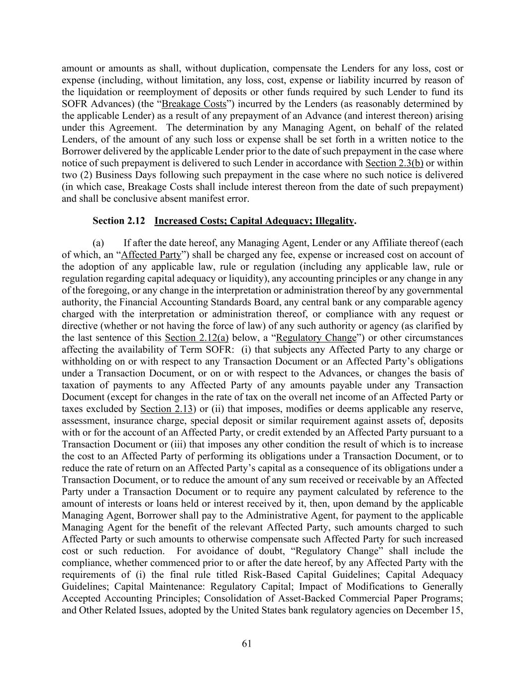 61 amount or amounts as shall, without duplication, compensate the Lenders for any loss, cost or expense (including, without limitation, any loss, cost, expense or liability incurred by reason of the liquidation or reemployment of deposits or other funds required by such Lender to fund its SOFR Advances) (the “Breakage Costs”) incurred by the Lenders (as reasonably determined by the applicable Lender) as a result of any prepayment of an Advance (and interest thereon) arising under this Agreement. The determination by any Managing Agent, on behalf of the related Lenders, of the amount of any such loss or expense shall be set forth in a written notice to the Borrower delivered by the applicable Lender prior to the date of such prepayment in the case where notice of such prepayment is delivered to such Lender in accordance with Section 2.3(b) or within two (2) Business Days following such prepayment in the case where no such notice is delivered (in which case, Breakage Costs shall include interest thereon from the date of such prepayment) and shall be conclusive absent manifest error. Section 2.12 Increased Costs; Capital Adequacy; Illegality. (a) If after the date hereof, any Managing Agent, Lender or any Affiliate thereof (each of which, an “Affected Party”) shall be charged any fee, expense or increased cost on account of the adoption of any applicable law, rule or regulation (including any applicable law, rule or regulation regarding capital adequacy or liquidity), any accounting principles or any change in any of the foregoing, or any change in the interpretation or administration thereof by any governmental authority, the Financial Accounting Standards Board, any central bank or any comparable agency charged with the interpretation or administration thereof, or compliance with any request or directive (whether or not having the force of law) of any such authority or agency (as clarified by the last sentence of this Section 2.12(a) below, a “Regulatory Change”) or other circumstances affecting the availability of Term SOFR: (i) that subjects any Affected Party to any charge or withholding on or with respect to any Transaction Document or an Affected Party’s obligations under a Transaction Document, or on or with respect to the Advances, or changes the basis of taxation of payments to any Affected Party of any amounts payable under any Transaction Document (except for changes in the rate of tax on the overall net income of an Affected Party or taxes excluded by Section 2.13) or (ii) that imposes, modifies or deems applicable any reserve, assessment, insurance charge, special deposit or similar requirement against assets of, deposits with or for the account of an Affected Party, or credit extended by an Affected Party pursuant to a Transaction Document or (iii) that imposes any other condition the result of which is to increase the cost to an Affected Party of performing its obligations under a Transaction Document, or to reduce the rate of return on an Affected Party’s capital as a consequence of its obligations under a Transaction Document, or to reduce the amount of any sum received or receivable by an Affected Party under a Transaction Document or to require any payment calculated by reference to the amount of interests or loans held or interest received by it, then, upon demand by the applicable Managing Agent, Borrower shall pay to the Administrative Agent, for payment to the applicable Managing Agent for the benefit of the relevant Affected Party, such amounts charged to such Affected Party or such amounts to otherwise compensate such Affected Party for such increased cost or such reduction. For avoidance of doubt, “Regulatory Change” shall include the compliance, whether commenced prior to or after the date hereof, by any Affected Party with the requirements of (i) the final rule titled Risk-Based Capital Guidelines; Capital Adequacy Guidelines; Capital Maintenance: Regulatory Capital; Impact of Modifications to Generally Accepted Accounting Principles; Consolidation of Asset-Backed Commercial Paper Programs; and Other Related Issues, adopted by the United States bank regulatory agencies on December 15,
