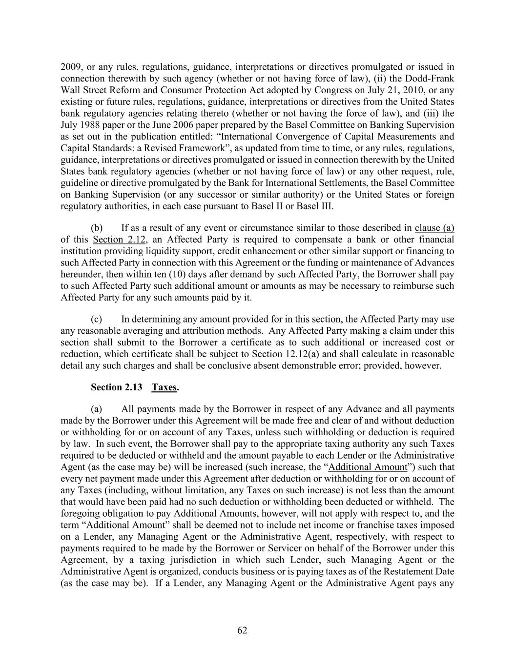 62 2009, or any rules, regulations, guidance, interpretations or directives promulgated or issued in connection therewith by such agency (whether or not having force of law), (ii) the Dodd-Frank Wall Street Reform and Consumer Protection Act adopted by Congress on July 21, 2010, or any existing or future rules, regulations, guidance, interpretations or directives from the United States bank regulatory agencies relating thereto (whether or not having the force of law), and (iii) the July 1988 paper or the June 2006 paper prepared by the Basel Committee on Banking Supervision as set out in the publication entitled: “International Convergence of Capital Measurements and Capital Standards: a Revised Framework”, as updated from time to time, or any rules, regulations, guidance, interpretations or directives promulgated or issued in connection therewith by the United States bank regulatory agencies (whether or not having force of law) or any other request, rule, guideline or directive promulgated by the Bank for International Settlements, the Basel Committee on Banking Supervision (or any successor or similar authority) or the United States or foreign regulatory authorities, in each case pursuant to Basel II or Basel III. (b) If as a result of any event or circumstance similar to those described in clause (a) of this Section 2.12, an Affected Party is required to compensate a bank or other financial institution providing liquidity support, credit enhancement or other similar support or financing to such Affected Party in connection with this Agreement or the funding or maintenance of Advances hereunder, then within ten (10) days after demand by such Affected Party, the Borrower shall pay to such Affected Party such additional amount or amounts as may be necessary to reimburse such Affected Party for any such amounts paid by it. (c) In determining any amount provided for in this section, the Affected Party may use any reasonable averaging and attribution methods. Any Affected Party making a claim under this section shall submit to the Borrower a certificate as to such additional or increased cost or reduction, which certificate shall be subject to Section 12.12(a) and shall calculate in reasonable detail any such charges and shall be conclusive absent demonstrable error; provided, however. Section 2.13 Taxes. (a) All payments made by the Borrower in respect of any Advance and all payments made by the Borrower under this Agreement will be made free and clear of and without deduction or withholding for or on account of any Taxes, unless such withholding or deduction is required by law. In such event, the Borrower shall pay to the appropriate taxing authority any such Taxes required to be deducted or withheld and the amount payable to each Lender or the Administrative Agent (as the case may be) will be increased (such increase, the “Additional Amount”) such that every net payment made under this Agreement after deduction or withholding for or on account of any Taxes (including, without limitation, any Taxes on such increase) is not less than the amount that would have been paid had no such deduction or withholding been deducted or withheld. The foregoing obligation to pay Additional Amounts, however, will not apply with respect to, and the term “Additional Amount” shall be deemed not to include net income or franchise taxes imposed on a Lender, any Managing Agent or the Administrative Agent, respectively, with respect to payments required to be made by the Borrower or Servicer on behalf of the Borrower under this Agreement, by a taxing jurisdiction in which such Lender, such Managing Agent or the Administrative Agent is organized, conducts business or is paying taxes as of the Restatement Date (as the case may be). If a Lender, any Managing Agent or the Administrative Agent pays any