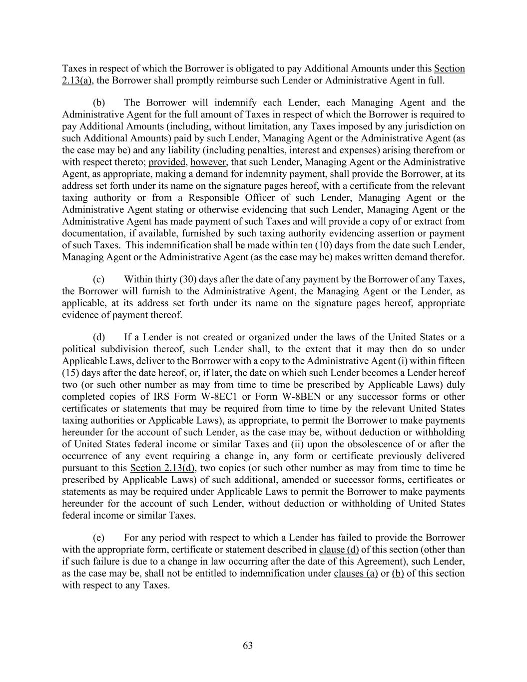 63 Taxes in respect of which the Borrower is obligated to pay Additional Amounts under this Section 2.13(a), the Borrower shall promptly reimburse such Lender or Administrative Agent in full. (b) The Borrower will indemnify each Lender, each Managing Agent and the Administrative Agent for the full amount of Taxes in respect of which the Borrower is required to pay Additional Amounts (including, without limitation, any Taxes imposed by any jurisdiction on such Additional Amounts) paid by such Lender, Managing Agent or the Administrative Agent (as the case may be) and any liability (including penalties, interest and expenses) arising therefrom or with respect thereto; provided, however, that such Lender, Managing Agent or the Administrative Agent, as appropriate, making a demand for indemnity payment, shall provide the Borrower, at its address set forth under its name on the signature pages hereof, with a certificate from the relevant taxing authority or from a Responsible Officer of such Lender, Managing Agent or the Administrative Agent stating or otherwise evidencing that such Lender, Managing Agent or the Administrative Agent has made payment of such Taxes and will provide a copy of or extract from documentation, if available, furnished by such taxing authority evidencing assertion or payment of such Taxes. This indemnification shall be made within ten (10) days from the date such Lender, Managing Agent or the Administrative Agent (as the case may be) makes written demand therefor. (c) Within thirty (30) days after the date of any payment by the Borrower of any Taxes, the Borrower will furnish to the Administrative Agent, the Managing Agent or the Lender, as applicable, at its address set forth under its name on the signature pages hereof, appropriate evidence of payment thereof. (d) If a Lender is not created or organized under the laws of the United States or a political subdivision thereof, such Lender shall, to the extent that it may then do so under Applicable Laws, deliver to the Borrower with a copy to the Administrative Agent (i) within fifteen (15) days after the date hereof, or, if later, the date on which such Lender becomes a Lender hereof two (or such other number as may from time to time be prescribed by Applicable Laws) duly completed copies of IRS Form W-8EC1 or Form W-8BEN or any successor forms or other certificates or statements that may be required from time to time by the relevant United States taxing authorities or Applicable Laws), as appropriate, to permit the Borrower to make payments hereunder for the account of such Lender, as the case may be, without deduction or withholding of United States federal income or similar Taxes and (ii) upon the obsolescence of or after the occurrence of any event requiring a change in, any form or certificate previously delivered pursuant to this Section 2.13(d), two copies (or such other number as may from time to time be prescribed by Applicable Laws) of such additional, amended or successor forms, certificates or statements as may be required under Applicable Laws to permit the Borrower to make payments hereunder for the account of such Lender, without deduction or withholding of United States federal income or similar Taxes. (e) For any period with respect to which a Lender has failed to provide the Borrower with the appropriate form, certificate or statement described in clause (d) of this section (other than if such failure is due to a change in law occurring after the date of this Agreement), such Lender, as the case may be, shall not be entitled to indemnification under clauses (a) or (b) of this section with respect to any Taxes.