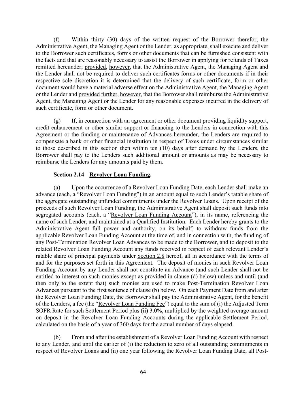 64 (f) Within thirty (30) days of the written request of the Borrower therefor, the Administrative Agent, the Managing Agent or the Lender, as appropriate, shall execute and deliver to the Borrower such certificates, forms or other documents that can be furnished consistent with the facts and that are reasonably necessary to assist the Borrower in applying for refunds of Taxes remitted hereunder; provided, however, that the Administrative Agent, the Managing Agent and the Lender shall not be required to deliver such certificates forms or other documents if in their respective sole discretion it is determined that the delivery of such certificate, form or other document would have a material adverse effect on the Administrative Agent, the Managing Agent or the Lender and provided further, however, that the Borrower shall reimburse the Administrative Agent, the Managing Agent or the Lender for any reasonable expenses incurred in the delivery of such certificate, form or other document. (g) If, in connection with an agreement or other document providing liquidity support, credit enhancement or other similar support or financing to the Lenders in connection with this Agreement or the funding or maintenance of Advances hereunder, the Lenders are required to compensate a bank or other financial institution in respect of Taxes under circumstances similar to those described in this section then within ten (10) days after demand by the Lenders, the Borrower shall pay to the Lenders such additional amount or amounts as may be necessary to reimburse the Lenders for any amounts paid by them. Section 2.14 Revolver Loan Funding. (a) Upon the occurrence of a Revolver Loan Funding Date, each Lender shall make an advance (each, a “Revolver Loan Funding”) in an amount equal to such Lender’s ratable share of the aggregate outstanding unfunded commitments under the Revolver Loans. Upon receipt of the proceeds of such Revolver Loan Funding, the Administrative Agent shall deposit such funds into segregated accounts (each, a “Revolver Loan Funding Account”), in its name, referencing the name of such Lender, and maintained at a Qualified Institution. Each Lender hereby grants to the Administrative Agent full power and authority, on its behalf, to withdraw funds from the applicable Revolver Loan Funding Account at the time of, and in connection with, the funding of any Post-Termination Revolver Loan Advances to be made to the Borrower, and to deposit to the related Revolver Loan Funding Account any funds received in respect of each relevant Lender’s ratable share of principal payments under Section 2.8 hereof, all in accordance with the terms of and for the purposes set forth in this Agreement. The deposit of monies in such Revolver Loan Funding Account by any Lender shall not constitute an Advance (and such Lender shall not be entitled to interest on such monies except as provided in clause (d) below) unless and until (and then only to the extent that) such monies are used to make Post-Termination Revolver Loan Advances pursuant to the first sentence of clause (b) below. On each Payment Date from and after the Revolver Loan Funding Date, the Borrower shall pay the Administrative Agent, for the benefit of the Lenders, a fee (the “Revolver Loan Funding Fee”) equal to the sum of (i) the Adjusted Term SOFR Rate for such Settlement Period plus (ii) 3.0%, multiplied by the weighted average amount on deposit in the Revolver Loan Funding Accounts during the applicable Settlement Period, calculated on the basis of a year of 360 days for the actual number of days elapsed. (b) From and after the establishment of a Revolver Loan Funding Account with respect to any Lender, and until the earlier of (i) the reduction to zero of all outstanding commitments in respect of Revolver Loans and (ii) one year following the Revolver Loan Funding Date, all Post-