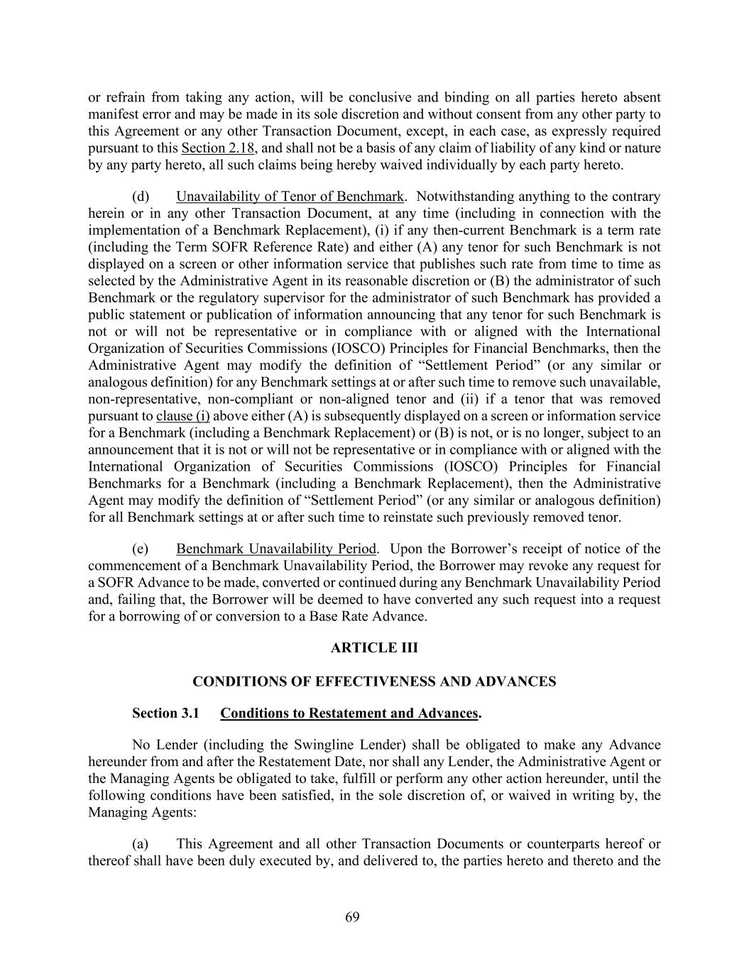 69 or refrain from taking any action, will be conclusive and binding on all parties hereto absent manifest error and may be made in its sole discretion and without consent from any other party to this Agreement or any other Transaction Document, except, in each case, as expressly required pursuant to this Section 2.18, and shall not be a basis of any claim of liability of any kind or nature by any party hereto, all such claims being hereby waived individually by each party hereto. (d) Unavailability of Tenor of Benchmark. Notwithstanding anything to the contrary herein or in any other Transaction Document, at any time (including in connection with the implementation of a Benchmark Replacement), (i) if any then-current Benchmark is a term rate (including the Term SOFR Reference Rate) and either (A) any tenor for such Benchmark is not displayed on a screen or other information service that publishes such rate from time to time as selected by the Administrative Agent in its reasonable discretion or (B) the administrator of such Benchmark or the regulatory supervisor for the administrator of such Benchmark has provided a public statement or publication of information announcing that any tenor for such Benchmark is not or will not be representative or in compliance with or aligned with the International Organization of Securities Commissions (IOSCO) Principles for Financial Benchmarks, then the Administrative Agent may modify the definition of “Settlement Period” (or any similar or analogous definition) for any Benchmark settings at or after such time to remove such unavailable, non-representative, non-compliant or non-aligned tenor and (ii) if a tenor that was removed pursuant to clause (i) above either (A) is subsequently displayed on a screen or information service for a Benchmark (including a Benchmark Replacement) or (B) is not, or is no longer, subject to an announcement that it is not or will not be representative or in compliance with or aligned with the International Organization of Securities Commissions (IOSCO) Principles for Financial Benchmarks for a Benchmark (including a Benchmark Replacement), then the Administrative Agent may modify the definition of “Settlement Period” (or any similar or analogous definition) for all Benchmark settings at or after such time to reinstate such previously removed tenor. (e) Benchmark Unavailability Period. Upon the Borrower’s receipt of notice of the commencement of a Benchmark Unavailability Period, the Borrower may revoke any request for a SOFR Advance to be made, converted or continued during any Benchmark Unavailability Period and, failing that, the Borrower will be deemed to have converted any such request into a request for a borrowing of or conversion to a Base Rate Advance. ARTICLE III CONDITIONS OF EFFECTIVENESS AND ADVANCES Section 3.1 Conditions to Restatement and Advances. No Lender (including the Swingline Lender) shall be obligated to make any Advance hereunder from and after the Restatement Date, nor shall any Lender, the Administrative Agent or the Managing Agents be obligated to take, fulfill or perform any other action hereunder, until the following conditions have been satisfied, in the sole discretion of, or waived in writing by, the Managing Agents: (a) This Agreement and all other Transaction Documents or counterparts hereof or thereof shall have been duly executed by, and delivered to, the parties hereto and thereto and the