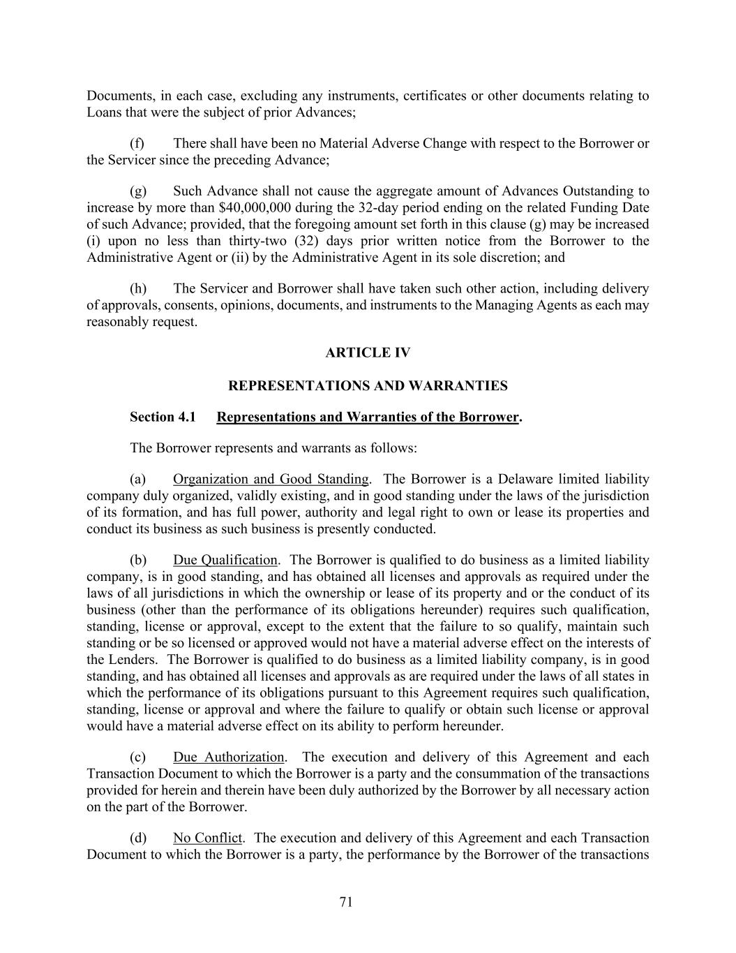 71 Documents, in each case, excluding any instruments, certificates or other documents relating to Loans that were the subject of prior Advances; (f) There shall have been no Material Adverse Change with respect to the Borrower or the Servicer since the preceding Advance; (g) Such Advance shall not cause the aggregate amount of Advances Outstanding to increase by more than $40,000,000 during the 32-day period ending on the related Funding Date of such Advance; provided, that the foregoing amount set forth in this clause (g) may be increased (i) upon no less than thirty-two (32) days prior written notice from the Borrower to the Administrative Agent or (ii) by the Administrative Agent in its sole discretion; and (h) The Servicer and Borrower shall have taken such other action, including delivery of approvals, consents, opinions, documents, and instruments to the Managing Agents as each may reasonably request. ARTICLE IV REPRESENTATIONS AND WARRANTIES Section 4.1 Representations and Warranties of the Borrower. The Borrower represents and warrants as follows: (a) Organization and Good Standing. The Borrower is a Delaware limited liability company duly organized, validly existing, and in good standing under the laws of the jurisdiction of its formation, and has full power, authority and legal right to own or lease its properties and conduct its business as such business is presently conducted. (b) Due Qualification. The Borrower is qualified to do business as a limited liability company, is in good standing, and has obtained all licenses and approvals as required under the laws of all jurisdictions in which the ownership or lease of its property and or the conduct of its business (other than the performance of its obligations hereunder) requires such qualification, standing, license or approval, except to the extent that the failure to so qualify, maintain such standing or be so licensed or approved would not have a material adverse effect on the interests of the Lenders. The Borrower is qualified to do business as a limited liability company, is in good standing, and has obtained all licenses and approvals as are required under the laws of all states in which the performance of its obligations pursuant to this Agreement requires such qualification, standing, license or approval and where the failure to qualify or obtain such license or approval would have a material adverse effect on its ability to perform hereunder. (c) Due Authorization. The execution and delivery of this Agreement and each Transaction Document to which the Borrower is a party and the consummation of the transactions provided for herein and therein have been duly authorized by the Borrower by all necessary action on the part of the Borrower. (d) No Conflict. The execution and delivery of this Agreement and each Transaction Document to which the Borrower is a party, the performance by the Borrower of the transactions