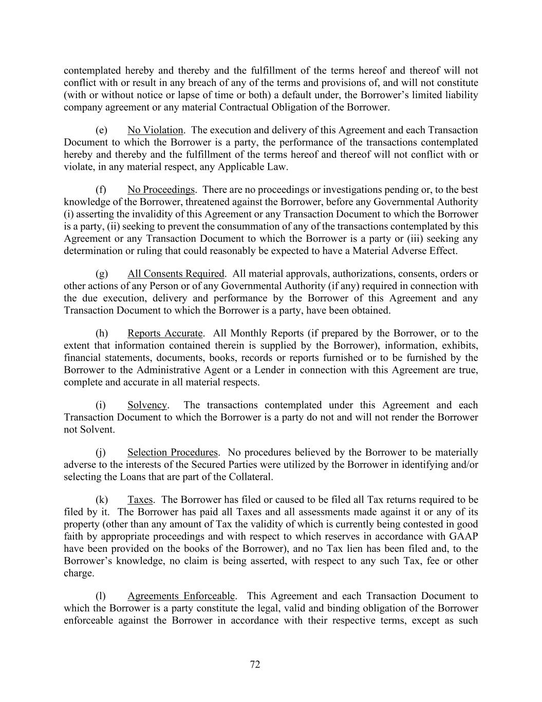 72 contemplated hereby and thereby and the fulfillment of the terms hereof and thereof will not conflict with or result in any breach of any of the terms and provisions of, and will not constitute (with or without notice or lapse of time or both) a default under, the Borrower’s limited liability company agreement or any material Contractual Obligation of the Borrower. (e) No Violation. The execution and delivery of this Agreement and each Transaction Document to which the Borrower is a party, the performance of the transactions contemplated hereby and thereby and the fulfillment of the terms hereof and thereof will not conflict with or violate, in any material respect, any Applicable Law. (f) No Proceedings. There are no proceedings or investigations pending or, to the best knowledge of the Borrower, threatened against the Borrower, before any Governmental Authority (i) asserting the invalidity of this Agreement or any Transaction Document to which the Borrower is a party, (ii) seeking to prevent the consummation of any of the transactions contemplated by this Agreement or any Transaction Document to which the Borrower is a party or (iii) seeking any determination or ruling that could reasonably be expected to have a Material Adverse Effect. (g) All Consents Required. All material approvals, authorizations, consents, orders or other actions of any Person or of any Governmental Authority (if any) required in connection with the due execution, delivery and performance by the Borrower of this Agreement and any Transaction Document to which the Borrower is a party, have been obtained. (h) Reports Accurate. All Monthly Reports (if prepared by the Borrower, or to the extent that information contained therein is supplied by the Borrower), information, exhibits, financial statements, documents, books, records or reports furnished or to be furnished by the Borrower to the Administrative Agent or a Lender in connection with this Agreement are true, complete and accurate in all material respects. (i) Solvency. The transactions contemplated under this Agreement and each Transaction Document to which the Borrower is a party do not and will not render the Borrower not Solvent. (j) Selection Procedures. No procedures believed by the Borrower to be materially adverse to the interests of the Secured Parties were utilized by the Borrower in identifying and/or selecting the Loans that are part of the Collateral. (k) Taxes. The Borrower has filed or caused to be filed all Tax returns required to be filed by it. The Borrower has paid all Taxes and all assessments made against it or any of its property (other than any amount of Tax the validity of which is currently being contested in good faith by appropriate proceedings and with respect to which reserves in accordance with GAAP have been provided on the books of the Borrower), and no Tax lien has been filed and, to the Borrower’s knowledge, no claim is being asserted, with respect to any such Tax, fee or other charge. (l) Agreements Enforceable. This Agreement and each Transaction Document to which the Borrower is a party constitute the legal, valid and binding obligation of the Borrower enforceable against the Borrower in accordance with their respective terms, except as such