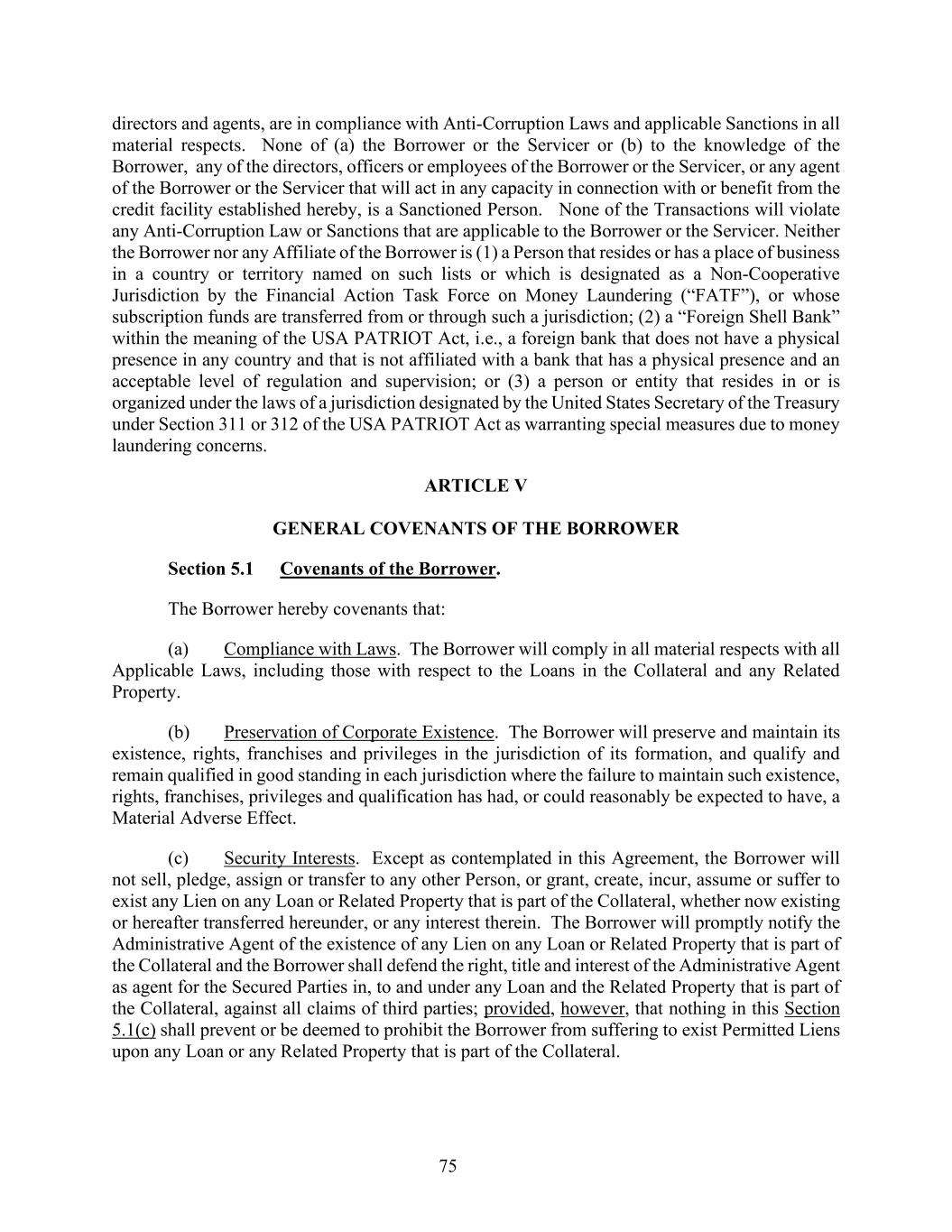 75 directors and agents, are in compliance with Anti-Corruption Laws and applicable Sanctions in all material respects. None of (a) the Borrower or the Servicer or (b) to the knowledge of the Borrower, any of the directors, officers or employees of the Borrower or the Servicer, or any agent of the Borrower or the Servicer that will act in any capacity in connection with or benefit from the credit facility established hereby, is a Sanctioned Person. None of the Transactions will violate any Anti-Corruption Law or Sanctions that are applicable to the Borrower or the Servicer. Neither the Borrower nor any Affiliate of the Borrower is (1) a Person that resides or has a place of business in a country or territory named on such lists or which is designated as a Non-Cooperative Jurisdiction by the Financial Action Task Force on Money Laundering (“FATF”), or whose subscription funds are transferred from or through such a jurisdiction; (2) a “Foreign Shell Bank” within the meaning of the USA PATRIOT Act, i.e., a foreign bank that does not have a physical presence in any country and that is not affiliated with a bank that has a physical presence and an acceptable level of regulation and supervision; or (3) a person or entity that resides in or is organized under the laws of a jurisdiction designated by the United States Secretary of the Treasury under Section 311 or 312 of the USA PATRIOT Act as warranting special measures due to money laundering concerns. ARTICLE V GENERAL COVENANTS OF THE BORROWER Section 5.1 Covenants of the Borrower. The Borrower hereby covenants that: (a) Compliance with Laws. The Borrower will comply in all material respects with all Applicable Laws, including those with respect to the Loans in the Collateral and any Related Property. (b) Preservation of Corporate Existence. The Borrower will preserve and maintain its existence, rights, franchises and privileges in the jurisdiction of its formation, and qualify and remain qualified in good standing in each jurisdiction where the failure to maintain such existence, rights, franchises, privileges and qualification has had, or could reasonably be expected to have, a Material Adverse Effect. (c) Security Interests. Except as contemplated in this Agreement, the Borrower will not sell, pledge, assign or transfer to any other Person, or grant, create, incur, assume or suffer to exist any Lien on any Loan or Related Property that is part of the Collateral, whether now existing or hereafter transferred hereunder, or any interest therein. The Borrower will promptly notify the Administrative Agent of the existence of any Lien on any Loan or Related Property that is part of the Collateral and the Borrower shall defend the right, title and interest of the Administrative Agent as agent for the Secured Parties in, to and under any Loan and the Related Property that is part of the Collateral, against all claims of third parties; provided, however, that nothing in this Section 5.1(c) shall prevent or be deemed to prohibit the Borrower from suffering to exist Permitted Liens upon any Loan or any Related Property that is part of the Collateral.