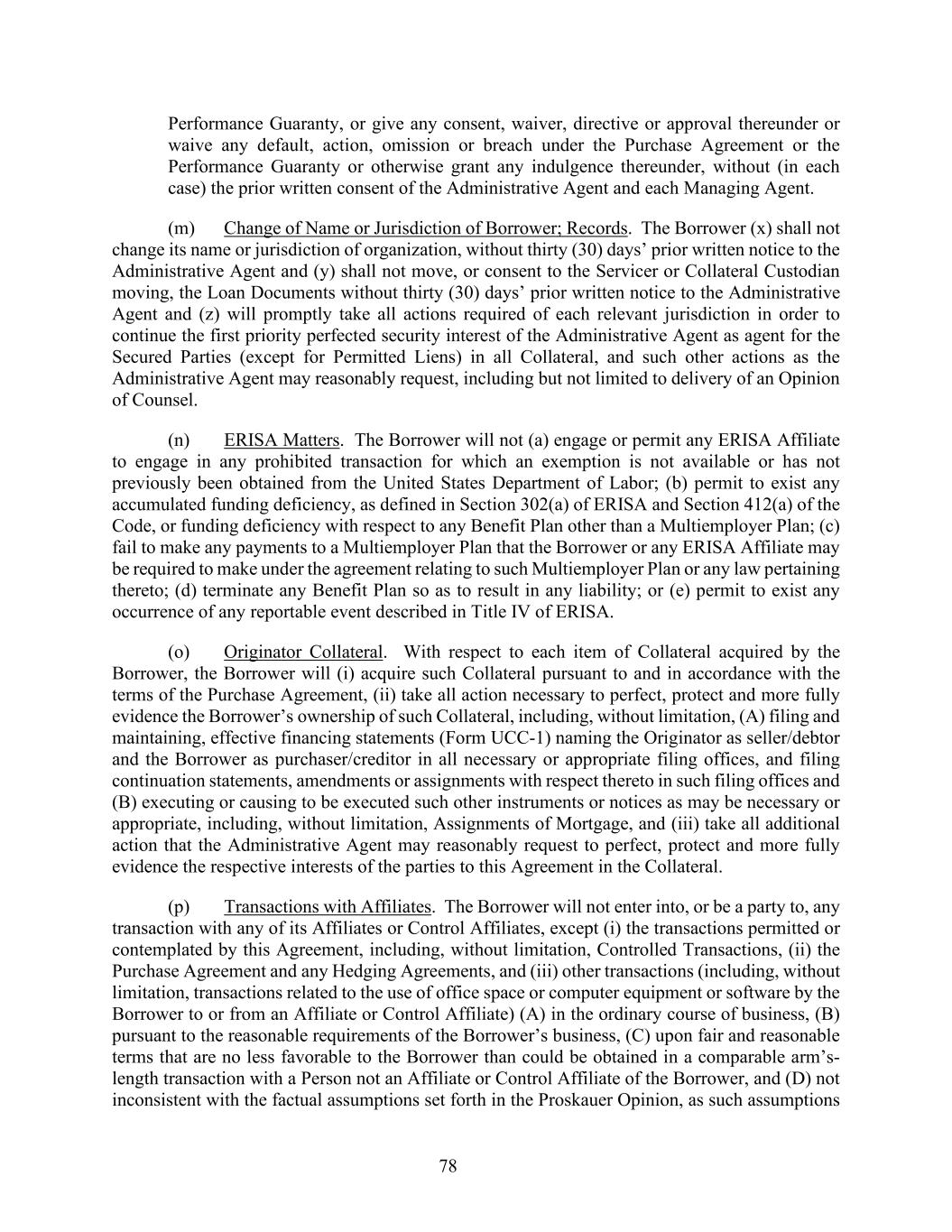 78 Performance Guaranty, or give any consent, waiver, directive or approval thereunder or waive any default, action, omission or breach under the Purchase Agreement or the Performance Guaranty or otherwise grant any indulgence thereunder, without (in each case) the prior written consent of the Administrative Agent and each Managing Agent. (m) Change of Name or Jurisdiction of Borrower; Records. The Borrower (x) shall not change its name or jurisdiction of organization, without thirty (30) days’ prior written notice to the Administrative Agent and (y) shall not move, or consent to the Servicer or Collateral Custodian moving, the Loan Documents without thirty (30) days’ prior written notice to the Administrative Agent and (z) will promptly take all actions required of each relevant jurisdiction in order to continue the first priority perfected security interest of the Administrative Agent as agent for the Secured Parties (except for Permitted Liens) in all Collateral, and such other actions as the Administrative Agent may reasonably request, including but not limited to delivery of an Opinion of Counsel. (n) ERISA Matters. The Borrower will not (a) engage or permit any ERISA Affiliate to engage in any prohibited transaction for which an exemption is not available or has not previously been obtained from the United States Department of Labor; (b) permit to exist any accumulated funding deficiency, as defined in Section 302(a) of ERISA and Section 412(a) of the Code, or funding deficiency with respect to any Benefit Plan other than a Multiemployer Plan; (c) fail to make any payments to a Multiemployer Plan that the Borrower or any ERISA Affiliate may be required to make under the agreement relating to such Multiemployer Plan or any law pertaining thereto; (d) terminate any Benefit Plan so as to result in any liability; or (e) permit to exist any occurrence of any reportable event described in Title IV of ERISA. (o) Originator Collateral. With respect to each item of Collateral acquired by the Borrower, the Borrower will (i) acquire such Collateral pursuant to and in accordance with the terms of the Purchase Agreement, (ii) take all action necessary to perfect, protect and more fully evidence the Borrower’s ownership of such Collateral, including, without limitation, (A) filing and maintaining, effective financing statements (Form UCC-1) naming the Originator as seller/debtor and the Borrower as purchaser/creditor in all necessary or appropriate filing offices, and filing continuation statements, amendments or assignments with respect thereto in such filing offices and (B) executing or causing to be executed such other instruments or notices as may be necessary or appropriate, including, without limitation, Assignments of Mortgage, and (iii) take all additional action that the Administrative Agent may reasonably request to perfect, protect and more fully evidence the respective interests of the parties to this Agreement in the Collateral. (p) Transactions with Affiliates. The Borrower will not enter into, or be a party to, any transaction with any of its Affiliates or Control Affiliates, except (i) the transactions permitted or contemplated by this Agreement, including, without limitation, Controlled Transactions, (ii) the Purchase Agreement and any Hedging Agreements, and (iii) other transactions (including, without limitation, transactions related to the use of office space or computer equipment or software by the Borrower to or from an Affiliate or Control Affiliate) (A) in the ordinary course of business, (B) pursuant to the reasonable requirements of the Borrower’s business, (C) upon fair and reasonable terms that are no less favorable to the Borrower than could be obtained in a comparable arm’s- length transaction with a Person not an Affiliate or Control Affiliate of the Borrower, and (D) not inconsistent with the factual assumptions set forth in the Proskauer Opinion, as such assumptions