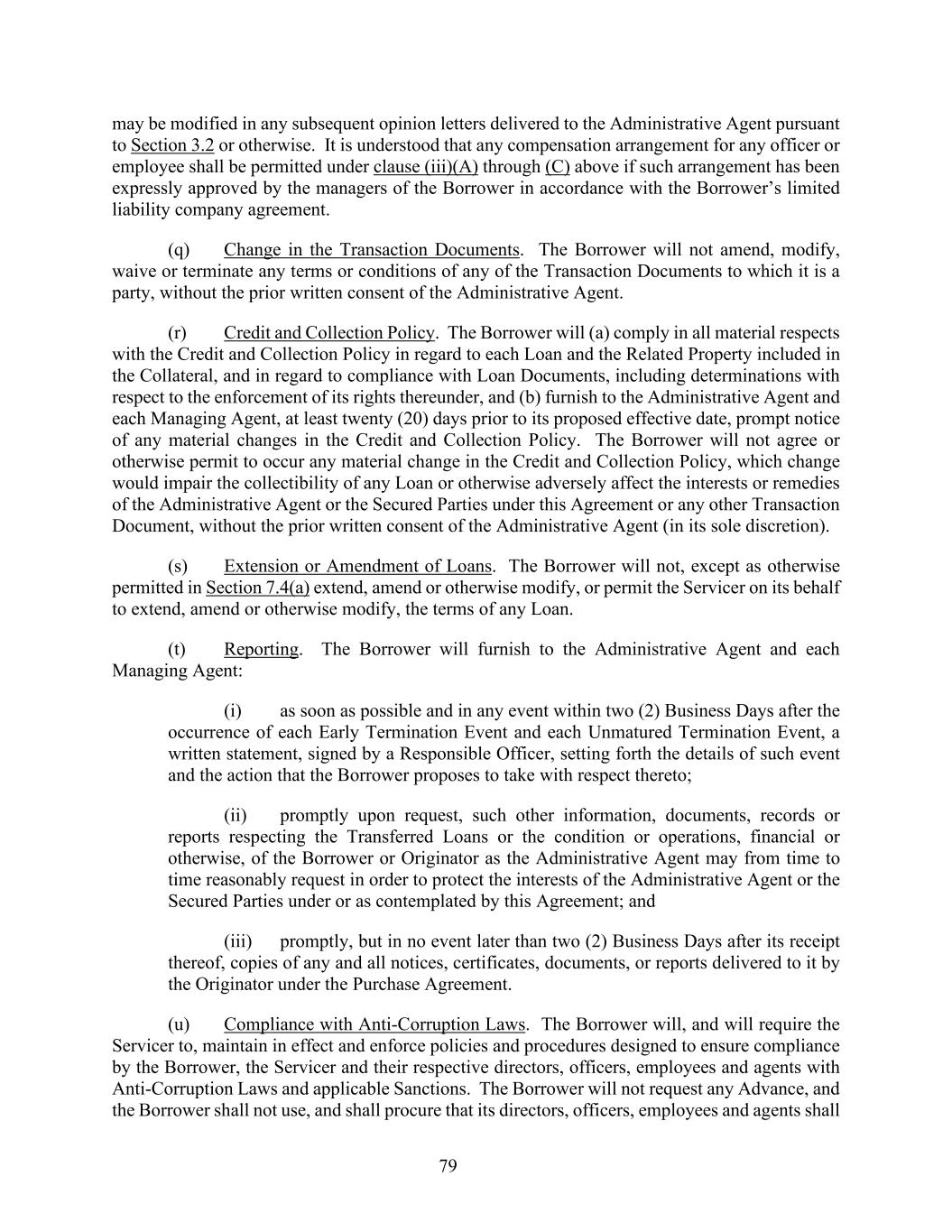 79 may be modified in any subsequent opinion letters delivered to the Administrative Agent pursuant to Section 3.2 or otherwise. It is understood that any compensation arrangement for any officer or employee shall be permitted under clause (iii)(A) through (C) above if such arrangement has been expressly approved by the managers of the Borrower in accordance with the Borrower’s limited liability company agreement. (q) Change in the Transaction Documents. The Borrower will not amend, modify, waive or terminate any terms or conditions of any of the Transaction Documents to which it is a party, without the prior written consent of the Administrative Agent. (r) Credit and Collection Policy. The Borrower will (a) comply in all material respects with the Credit and Collection Policy in regard to each Loan and the Related Property included in the Collateral, and in regard to compliance with Loan Documents, including determinations with respect to the enforcement of its rights thereunder, and (b) furnish to the Administrative Agent and each Managing Agent, at least twenty (20) days prior to its proposed effective date, prompt notice of any material changes in the Credit and Collection Policy. The Borrower will not agree or otherwise permit to occur any material change in the Credit and Collection Policy, which change would impair the collectibility of any Loan or otherwise adversely affect the interests or remedies of the Administrative Agent or the Secured Parties under this Agreement or any other Transaction Document, without the prior written consent of the Administrative Agent (in its sole discretion). (s) Extension or Amendment of Loans. The Borrower will not, except as otherwise permitted in Section 7.4(a) extend, amend or otherwise modify, or permit the Servicer on its behalf to extend, amend or otherwise modify, the terms of any Loan. (t) Reporting. The Borrower will furnish to the Administrative Agent and each Managing Agent: (i) as soon as possible and in any event within two (2) Business Days after the occurrence of each Early Termination Event and each Unmatured Termination Event, a written statement, signed by a Responsible Officer, setting forth the details of such event and the action that the Borrower proposes to take with respect thereto; (ii) promptly upon request, such other information, documents, records or reports respecting the Transferred Loans or the condition or operations, financial or otherwise, of the Borrower or Originator as the Administrative Agent may from time to time reasonably request in order to protect the interests of the Administrative Agent or the Secured Parties under or as contemplated by this Agreement; and (iii) promptly, but in no event later than two (2) Business Days after its receipt thereof, copies of any and all notices, certificates, documents, or reports delivered to it by the Originator under the Purchase Agreement. (u) Compliance with Anti-Corruption Laws. The Borrower will, and will require the Servicer to, maintain in effect and enforce policies and procedures designed to ensure compliance by the Borrower, the Servicer and their respective directors, officers, employees and agents with Anti-Corruption Laws and applicable Sanctions. The Borrower will not request any Advance, and the Borrower shall not use, and shall procure that its directors, officers, employees and agents shall