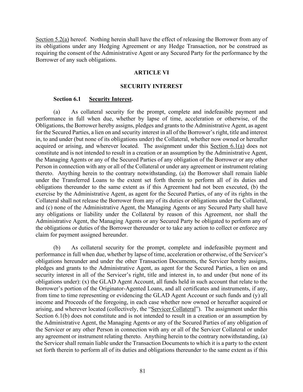 81 Section 5.2(a) hereof. Nothing herein shall have the effect of releasing the Borrower from any of its obligations under any Hedging Agreement or any Hedge Transaction, nor be construed as requiring the consent of the Administrative Agent or any Secured Party for the performance by the Borrower of any such obligations. ARTICLE VI SECURITY INTEREST Section 6.1 Security Interest. (a) As collateral security for the prompt, complete and indefeasible payment and performance in full when due, whether by lapse of time, acceleration or otherwise, of the Obligations, the Borrower hereby assigns, pledges and grants to the Administrative Agent, as agent for the Secured Parties, a lien on and security interest in all of the Borrower’s right, title and interest in, to and under (but none of its obligations under) the Collateral, whether now owned or hereafter acquired or arising, and wherever located. The assignment under this Section 6.1(a) does not constitute and is not intended to result in a creation or an assumption by the Administrative Agent, the Managing Agents or any of the Secured Parties of any obligation of the Borrower or any other Person in connection with any or all of the Collateral or under any agreement or instrument relating thereto. Anything herein to the contrary notwithstanding, (a) the Borrower shall remain liable under the Transferred Loans to the extent set forth therein to perform all of its duties and obligations thereunder to the same extent as if this Agreement had not been executed, (b) the exercise by the Administrative Agent, as agent for the Secured Parties, of any of its rights in the Collateral shall not release the Borrower from any of its duties or obligations under the Collateral, and (c) none of the Administrative Agent, the Managing Agents or any Secured Party shall have any obligations or liability under the Collateral by reason of this Agreement, nor shall the Administrative Agent, the Managing Agents or any Secured Party be obligated to perform any of the obligations or duties of the Borrower thereunder or to take any action to collect or enforce any claim for payment assigned hereunder. (b) As collateral security for the prompt, complete and indefeasible payment and performance in full when due, whether by lapse of time, acceleration or otherwise, of the Servicer’s obligations hereunder and under the other Transaction Documents, the Servicer hereby assigns, pledges and grants to the Administrative Agent, as agent for the Secured Parties, a lien on and security interest in all of the Servicer’s right, title and interest in, to and under (but none of its obligations under): (x) the GLAD Agent Account, all funds held in such account that relate to the Borrower’s portion of the Originator-Agented Loans, and all certificates and instruments, if any, from time to time representing or evidencing the GLAD Agent Account or such funds and (y) all income and Proceeds of the foregoing, in each case whether now owned or hereafter acquired or arising, and wherever located (collectively, the “Servicer Collateral”). The assignment under this Section 6.1(b) does not constitute and is not intended to result in a creation or an assumption by the Administrative Agent, the Managing Agents or any of the Secured Parties of any obligation of the Servicer or any other Person in connection with any or all of the Servicer Collateral or under any agreement or instrument relating thereto. Anything herein to the contrary notwithstanding, (a) the Servicer shall remain liable under the Transaction Documents to which it is a party to the extent set forth therein to perform all of its duties and obligations thereunder to the same extent as if this