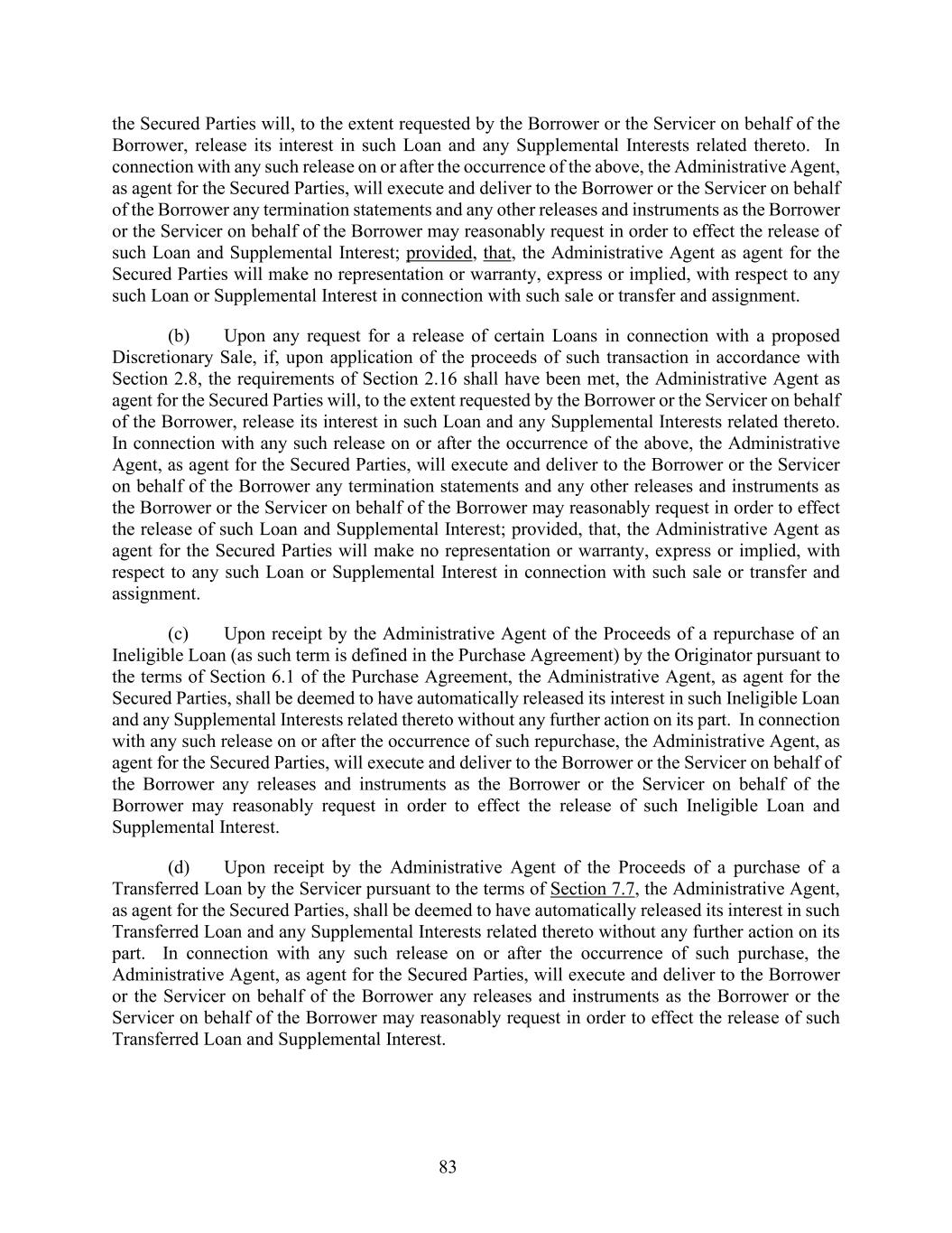 83 the Secured Parties will, to the extent requested by the Borrower or the Servicer on behalf of the Borrower, release its interest in such Loan and any Supplemental Interests related thereto. In connection with any such release on or after the occurrence of the above, the Administrative Agent, as agent for the Secured Parties, will execute and deliver to the Borrower or the Servicer on behalf of the Borrower any termination statements and any other releases and instruments as the Borrower or the Servicer on behalf of the Borrower may reasonably request in order to effect the release of such Loan and Supplemental Interest; provided, that, the Administrative Agent as agent for the Secured Parties will make no representation or warranty, express or implied, with respect to any such Loan or Supplemental Interest in connection with such sale or transfer and assignment. (b) Upon any request for a release of certain Loans in connection with a proposed Discretionary Sale, if, upon application of the proceeds of such transaction in accordance with Section 2.8, the requirements of Section 2.16 shall have been met, the Administrative Agent as agent for the Secured Parties will, to the extent requested by the Borrower or the Servicer on behalf of the Borrower, release its interest in such Loan and any Supplemental Interests related thereto. In connection with any such release on or after the occurrence of the above, the Administrative Agent, as agent for the Secured Parties, will execute and deliver to the Borrower or the Servicer on behalf of the Borrower any termination statements and any other releases and instruments as the Borrower or the Servicer on behalf of the Borrower may reasonably request in order to effect the release of such Loan and Supplemental Interest; provided, that, the Administrative Agent as agent for the Secured Parties will make no representation or warranty, express or implied, with respect to any such Loan or Supplemental Interest in connection with such sale or transfer and assignment. (c) Upon receipt by the Administrative Agent of the Proceeds of a repurchase of an Ineligible Loan (as such term is defined in the Purchase Agreement) by the Originator pursuant to the terms of Section 6.1 of the Purchase Agreement, the Administrative Agent, as agent for the Secured Parties, shall be deemed to have automatically released its interest in such Ineligible Loan and any Supplemental Interests related thereto without any further action on its part. In connection with any such release on or after the occurrence of such repurchase, the Administrative Agent, as agent for the Secured Parties, will execute and deliver to the Borrower or the Servicer on behalf of the Borrower any releases and instruments as the Borrower or the Servicer on behalf of the Borrower may reasonably request in order to effect the release of such Ineligible Loan and Supplemental Interest. (d) Upon receipt by the Administrative Agent of the Proceeds of a purchase of a Transferred Loan by the Servicer pursuant to the terms of Section 7.7, the Administrative Agent, as agent for the Secured Parties, shall be deemed to have automatically released its interest in such Transferred Loan and any Supplemental Interests related thereto without any further action on its part. In connection with any such release on or after the occurrence of such purchase, the Administrative Agent, as agent for the Secured Parties, will execute and deliver to the Borrower or the Servicer on behalf of the Borrower any releases and instruments as the Borrower or the Servicer on behalf of the Borrower may reasonably request in order to effect the release of such Transferred Loan and Supplemental Interest.