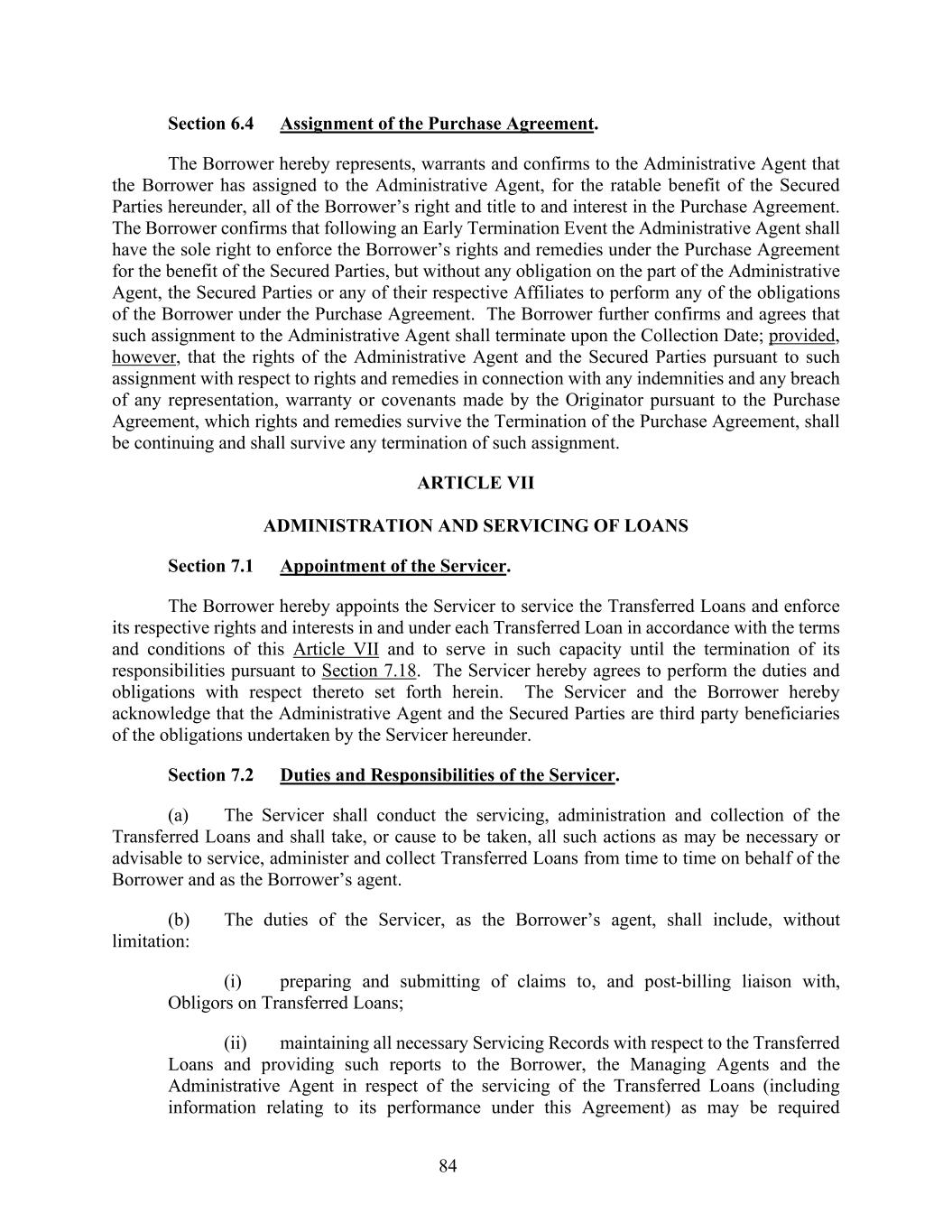 84 Section 6.4 Assignment of the Purchase Agreement. The Borrower hereby represents, warrants and confirms to the Administrative Agent that the Borrower has assigned to the Administrative Agent, for the ratable benefit of the Secured Parties hereunder, all of the Borrower’s right and title to and interest in the Purchase Agreement. The Borrower confirms that following an Early Termination Event the Administrative Agent shall have the sole right to enforce the Borrower’s rights and remedies under the Purchase Agreement for the benefit of the Secured Parties, but without any obligation on the part of the Administrative Agent, the Secured Parties or any of their respective Affiliates to perform any of the obligations of the Borrower under the Purchase Agreement. The Borrower further confirms and agrees that such assignment to the Administrative Agent shall terminate upon the Collection Date; provided, however, that the rights of the Administrative Agent and the Secured Parties pursuant to such assignment with respect to rights and remedies in connection with any indemnities and any breach of any representation, warranty or covenants made by the Originator pursuant to the Purchase Agreement, which rights and remedies survive the Termination of the Purchase Agreement, shall be continuing and shall survive any termination of such assignment. ARTICLE VII ADMINISTRATION AND SERVICING OF LOANS Section 7.1 Appointment of the Servicer. The Borrower hereby appoints the Servicer to service the Transferred Loans and enforce its respective rights and interests in and under each Transferred Loan in accordance with the terms and conditions of this Article VII and to serve in such capacity until the termination of its responsibilities pursuant to Section 7.18. The Servicer hereby agrees to perform the duties and obligations with respect thereto set forth herein. The Servicer and the Borrower hereby acknowledge that the Administrative Agent and the Secured Parties are third party beneficiaries of the obligations undertaken by the Servicer hereunder. Section 7.2 Duties and Responsibilities of the Servicer. (a) The Servicer shall conduct the servicing, administration and collection of the Transferred Loans and shall take, or cause to be taken, all such actions as may be necessary or advisable to service, administer and collect Transferred Loans from time to time on behalf of the Borrower and as the Borrower’s agent. (b) The duties of the Servicer, as the Borrower’s agent, shall include, without limitation: (i) preparing and submitting of claims to, and post-billing liaison with, Obligors on Transferred Loans; (ii) maintaining all necessary Servicing Records with respect to the Transferred Loans and providing such reports to the Borrower, the Managing Agents and the Administrative Agent in respect of the servicing of the Transferred Loans (including information relating to its performance under this Agreement) as may be required