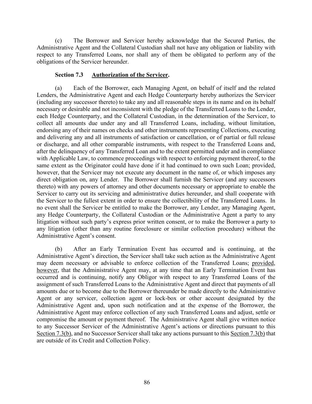 86 (c) The Borrower and Servicer hereby acknowledge that the Secured Parties, the Administrative Agent and the Collateral Custodian shall not have any obligation or liability with respect to any Transferred Loans, nor shall any of them be obligated to perform any of the obligations of the Servicer hereunder. Section 7.3 Authorization of the Servicer. (a) Each of the Borrower, each Managing Agent, on behalf of itself and the related Lenders, the Administrative Agent and each Hedge Counterparty hereby authorizes the Servicer (including any successor thereto) to take any and all reasonable steps in its name and on its behalf necessary or desirable and not inconsistent with the pledge of the Transferred Loans to the Lender, each Hedge Counterparty, and the Collateral Custodian, in the determination of the Servicer, to collect all amounts due under any and all Transferred Loans, including, without limitation, endorsing any of their names on checks and other instruments representing Collections, executing and delivering any and all instruments of satisfaction or cancellation, or of partial or full release or discharge, and all other comparable instruments, with respect to the Transferred Loans and, after the delinquency of any Transferred Loan and to the extent permitted under and in compliance with Applicable Law, to commence proceedings with respect to enforcing payment thereof, to the same extent as the Originator could have done if it had continued to own such Loan; provided, however, that the Servicer may not execute any document in the name of, or which imposes any direct obligation on, any Lender. The Borrower shall furnish the Servicer (and any successors thereto) with any powers of attorney and other documents necessary or appropriate to enable the Servicer to carry out its servicing and administrative duties hereunder, and shall cooperate with the Servicer to the fullest extent in order to ensure the collectibility of the Transferred Loans. In no event shall the Servicer be entitled to make the Borrower, any Lender, any Managing Agent, any Hedge Counterparty, the Collateral Custodian or the Administrative Agent a party to any litigation without such party’s express prior written consent, or to make the Borrower a party to any litigation (other than any routine foreclosure or similar collection procedure) without the Administrative Agent’s consent. (b) After an Early Termination Event has occurred and is continuing, at the Administrative Agent’s direction, the Servicer shall take such action as the Administrative Agent may deem necessary or advisable to enforce collection of the Transferred Loans; provided, however, that the Administrative Agent may, at any time that an Early Termination Event has occurred and is continuing, notify any Obligor with respect to any Transferred Loans of the assignment of such Transferred Loans to the Administrative Agent and direct that payments of all amounts due or to become due to the Borrower thereunder be made directly to the Administrative Agent or any servicer, collection agent or lock-box or other account designated by the Administrative Agent and, upon such notification and at the expense of the Borrower, the Administrative Agent may enforce collection of any such Transferred Loans and adjust, settle or compromise the amount or payment thereof. The Administrative Agent shall give written notice to any Successor Servicer of the Administrative Agent’s actions or directions pursuant to this Section 7.3(b), and no Successor Servicer shall take any actions pursuant to this Section 7.3(b) that are outside of its Credit and Collection Policy.