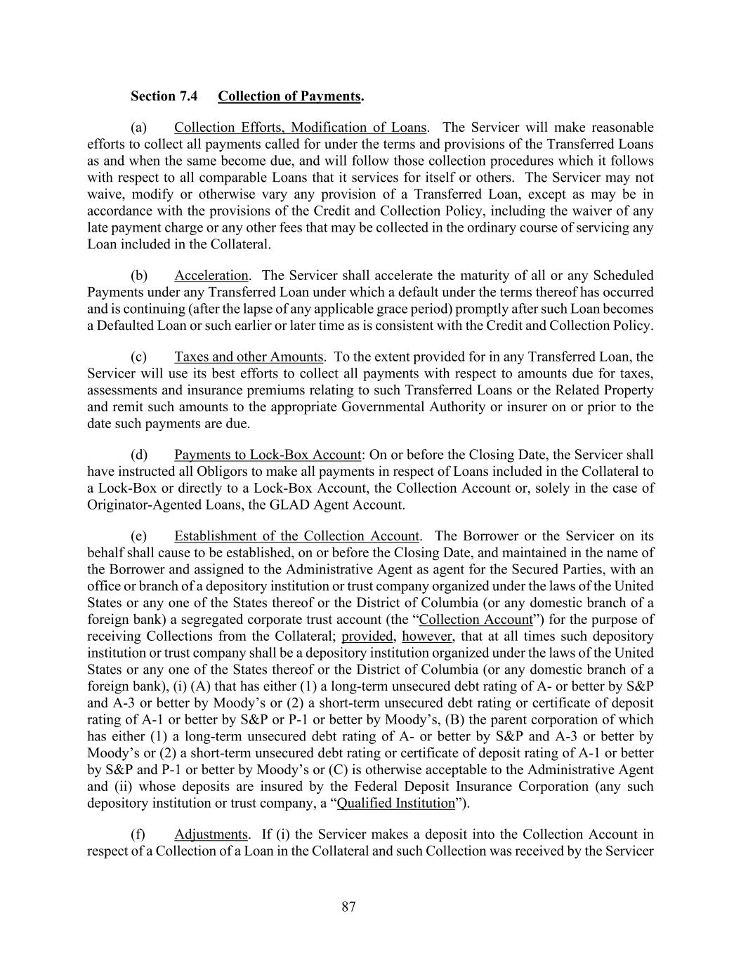 87 Section 7.4 Collection of Payments. (a) Collection Efforts, Modification of Loans. The Servicer will make reasonable efforts to collect all payments called for under the terms and provisions of the Transferred Loans as and when the same become due, and will follow those collection procedures which it follows with respect to all comparable Loans that it services for itself or others. The Servicer may not waive, modify or otherwise vary any provision of a Transferred Loan, except as may be in accordance with the provisions of the Credit and Collection Policy, including the waiver of any late payment charge or any other fees that may be collected in the ordinary course of servicing any Loan included in the Collateral. (b) Acceleration. The Servicer shall accelerate the maturity of all or any Scheduled Payments under any Transferred Loan under which a default under the terms thereof has occurred and is continuing (after the lapse of any applicable grace period) promptly after such Loan becomes a Defaulted Loan or such earlier or later time as is consistent with the Credit and Collection Policy. (c) Taxes and other Amounts. To the extent provided for in any Transferred Loan, the Servicer will use its best efforts to collect all payments with respect to amounts due for taxes, assessments and insurance premiums relating to such Transferred Loans or the Related Property and remit such amounts to the appropriate Governmental Authority or insurer on or prior to the date such payments are due. (d) Payments to Lock-Box Account: On or before the Closing Date, the Servicer shall have instructed all Obligors to make all payments in respect of Loans included in the Collateral to a Lock-Box or directly to a Lock-Box Account, the Collection Account or, solely in the case of Originator-Agented Loans, the GLAD Agent Account. (e) Establishment of the Collection Account. The Borrower or the Servicer on its behalf shall cause to be established, on or before the Closing Date, and maintained in the name of the Borrower and assigned to the Administrative Agent as agent for the Secured Parties, with an office or branch of a depository institution or trust company organized under the laws of the United States or any one of the States thereof or the District of Columbia (or any domestic branch of a foreign bank) a segregated corporate trust account (the “Collection Account”) for the purpose of receiving Collections from the Collateral; provided, however, that at all times such depository institution or trust company shall be a depository institution organized under the laws of the United States or any one of the States thereof or the District of Columbia (or any domestic branch of a foreign bank), (i) (A) that has either (1) a long-term unsecured debt rating of A- or better by S&P and A-3 or better by Moody’s or (2) a short-term unsecured debt rating or certificate of deposit rating of A-1 or better by S&P or P-1 or better by Moody’s, (B) the parent corporation of which has either (1) a long-term unsecured debt rating of A- or better by S&P and A-3 or better by Moody’s or (2) a short-term unsecured debt rating or certificate of deposit rating of A-1 or better by S&P and P-1 or better by Moody’s or (C) is otherwise acceptable to the Administrative Agent and (ii) whose deposits are insured by the Federal Deposit Insurance Corporation (any such depository institution or trust company, a “Qualified Institution”). (f) Adjustments. If (i) the Servicer makes a deposit into the Collection Account in respect of a Collection of a Loan in the Collateral and such Collection was received by the Servicer