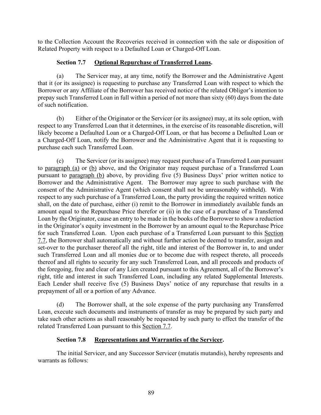 89 to the Collection Account the Recoveries received in connection with the sale or disposition of Related Property with respect to a Defaulted Loan or Charged-Off Loan. Section 7.7 Optional Repurchase of Transferred Loans. (a) The Servicer may, at any time, notify the Borrower and the Administrative Agent that it (or its assignee) is requesting to purchase any Transferred Loan with respect to which the Borrower or any Affiliate of the Borrower has received notice of the related Obligor’s intention to prepay such Transferred Loan in full within a period of not more than sixty (60) days from the date of such notification. (b) Either of the Originator or the Servicer (or its assignee) may, at its sole option, with respect to any Transferred Loan that it determines, in the exercise of its reasonable discretion, will likely become a Defaulted Loan or a Charged-Off Loan, or that has become a Defaulted Loan or a Charged-Off Loan, notify the Borrower and the Administrative Agent that it is requesting to purchase each such Transferred Loan. (c) The Servicer (or its assignee) may request purchase of a Transferred Loan pursuant to paragraph (a) or (b) above, and the Originator may request purchase of a Transferred Loan pursuant to paragraph (b) above, by providing five (5) Business Days’ prior written notice to Borrower and the Administrative Agent. The Borrower may agree to such purchase with the consent of the Administrative Agent (which consent shall not be unreasonably withheld). With respect to any such purchase of a Transferred Loan, the party providing the required written notice shall, on the date of purchase, either (i) remit to the Borrower in immediately available funds an amount equal to the Repurchase Price therefor or (ii) in the case of a purchase of a Transferred Loan by the Originator, cause an entry to be made in the books of the Borrower to show a reduction in the Originator’s equity investment in the Borrower by an amount equal to the Repurchase Price for such Transferred Loan. Upon each purchase of a Transferred Loan pursuant to this Section 7.7, the Borrower shall automatically and without further action be deemed to transfer, assign and set-over to the purchaser thereof all the right, title and interest of the Borrower in, to and under such Transferred Loan and all monies due or to become due with respect thereto, all proceeds thereof and all rights to security for any such Transferred Loan, and all proceeds and products of the foregoing, free and clear of any Lien created pursuant to this Agreement, all of the Borrower’s right, title and interest in such Transferred Loan, including any related Supplemental Interests. Each Lender shall receive five (5) Business Days’ notice of any repurchase that results in a prepayment of all or a portion of any Advance. (d) The Borrower shall, at the sole expense of the party purchasing any Transferred Loan, execute such documents and instruments of transfer as may be prepared by such party and take such other actions as shall reasonably be requested by such party to effect the transfer of the related Transferred Loan pursuant to this Section 7.7. Section 7.8 Representations and Warranties of the Servicer. The initial Servicer, and any Successor Servicer (mutatis mutandis), hereby represents and warrants as follows: