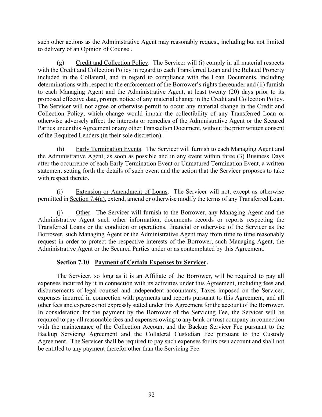 92 such other actions as the Administrative Agent may reasonably request, including but not limited to delivery of an Opinion of Counsel. (g) Credit and Collection Policy. The Servicer will (i) comply in all material respects with the Credit and Collection Policy in regard to each Transferred Loan and the Related Property included in the Collateral, and in regard to compliance with the Loan Documents, including determinations with respect to the enforcement of the Borrower’s rights thereunder and (ii) furnish to each Managing Agent and the Administrative Agent, at least twenty (20) days prior to its proposed effective date, prompt notice of any material change in the Credit and Collection Policy. The Servicer will not agree or otherwise permit to occur any material change in the Credit and Collection Policy, which change would impair the collectibility of any Transferred Loan or otherwise adversely affect the interests or remedies of the Administrative Agent or the Secured Parties under this Agreement or any other Transaction Document, without the prior written consent of the Required Lenders (in their sole discretion). (h) Early Termination Events. The Servicer will furnish to each Managing Agent and the Administrative Agent, as soon as possible and in any event within three (3) Business Days after the occurrence of each Early Termination Event or Unmatured Termination Event, a written statement setting forth the details of such event and the action that the Servicer proposes to take with respect thereto. (i) Extension or Amendment of Loans. The Servicer will not, except as otherwise permitted in Section 7.4(a), extend, amend or otherwise modify the terms of any Transferred Loan. (j) Other. The Servicer will furnish to the Borrower, any Managing Agent and the Administrative Agent such other information, documents records or reports respecting the Transferred Loans or the condition or operations, financial or otherwise of the Servicer as the Borrower, such Managing Agent or the Administrative Agent may from time to time reasonably request in order to protect the respective interests of the Borrower, such Managing Agent, the Administrative Agent or the Secured Parties under or as contemplated by this Agreement. Section 7.10 Payment of Certain Expenses by Servicer. The Servicer, so long as it is an Affiliate of the Borrower, will be required to pay all expenses incurred by it in connection with its activities under this Agreement, including fees and disbursements of legal counsel and independent accountants, Taxes imposed on the Servicer, expenses incurred in connection with payments and reports pursuant to this Agreement, and all other fees and expenses not expressly stated under this Agreement for the account of the Borrower. In consideration for the payment by the Borrower of the Servicing Fee, the Servicer will be required to pay all reasonable fees and expenses owing to any bank or trust company in connection with the maintenance of the Collection Account and the Backup Servicer Fee pursuant to the Backup Servicing Agreement and the Collateral Custodian Fee pursuant to the Custody Agreement. The Servicer shall be required to pay such expenses for its own account and shall not be entitled to any payment therefor other than the Servicing Fee.