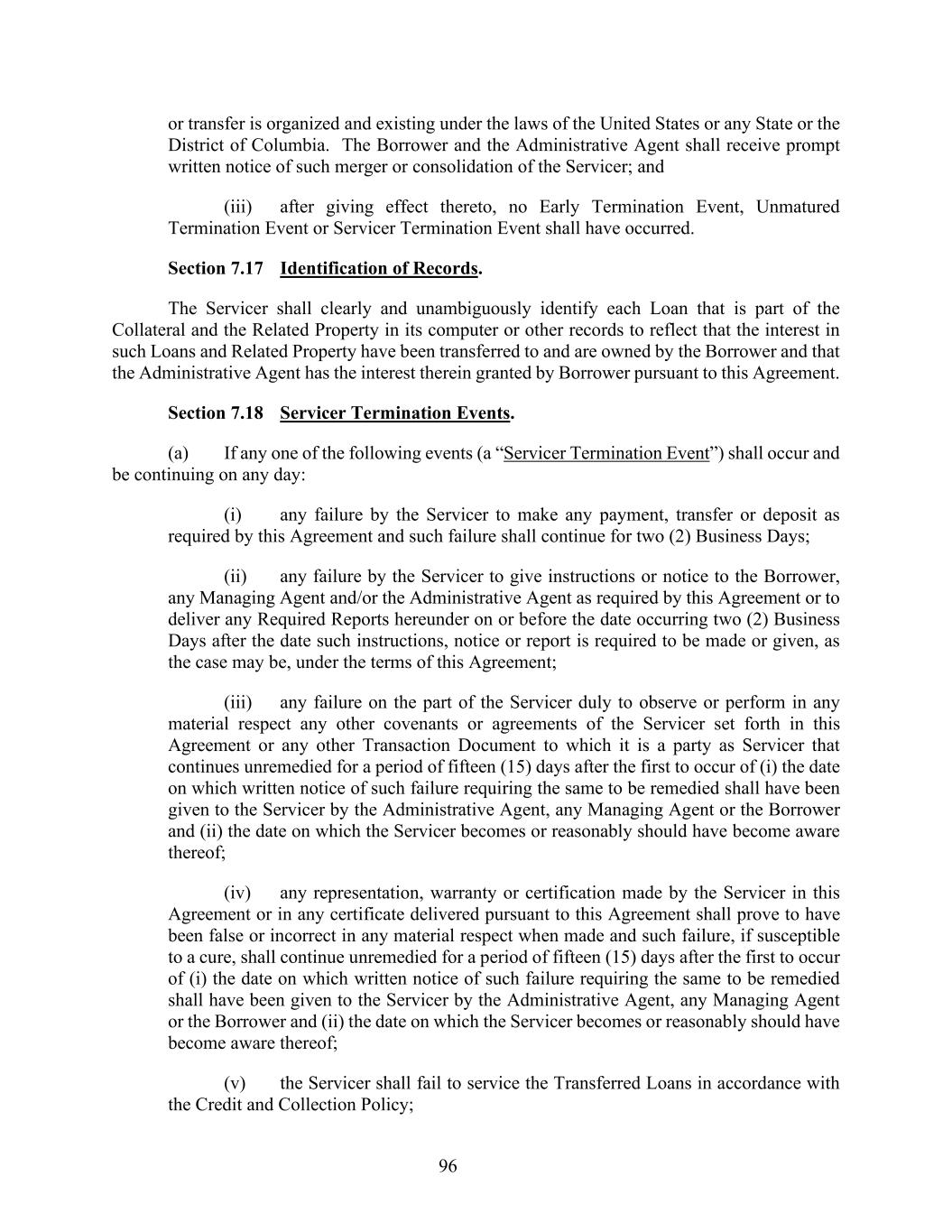 96 or transfer is organized and existing under the laws of the United States or any State or the District of Columbia. The Borrower and the Administrative Agent shall receive prompt written notice of such merger or consolidation of the Servicer; and (iii) after giving effect thereto, no Early Termination Event, Unmatured Termination Event or Servicer Termination Event shall have occurred. Section 7.17 Identification of Records. The Servicer shall clearly and unambiguously identify each Loan that is part of the Collateral and the Related Property in its computer or other records to reflect that the interest in such Loans and Related Property have been transferred to and are owned by the Borrower and that the Administrative Agent has the interest therein granted by Borrower pursuant to this Agreement. Section 7.18 Servicer Termination Events. (a) If any one of the following events (a “Servicer Termination Event”) shall occur and be continuing on any day: (i) any failure by the Servicer to make any payment, transfer or deposit as required by this Agreement and such failure shall continue for two (2) Business Days; (ii) any failure by the Servicer to give instructions or notice to the Borrower, any Managing Agent and/or the Administrative Agent as required by this Agreement or to deliver any Required Reports hereunder on or before the date occurring two (2) Business Days after the date such instructions, notice or report is required to be made or given, as the case may be, under the terms of this Agreement; (iii) any failure on the part of the Servicer duly to observe or perform in any material respect any other covenants or agreements of the Servicer set forth in this Agreement or any other Transaction Document to which it is a party as Servicer that continues unremedied for a period of fifteen (15) days after the first to occur of (i) the date on which written notice of such failure requiring the same to be remedied shall have been given to the Servicer by the Administrative Agent, any Managing Agent or the Borrower and (ii) the date on which the Servicer becomes or reasonably should have become aware thereof; (iv) any representation, warranty or certification made by the Servicer in this Agreement or in any certificate delivered pursuant to this Agreement shall prove to have been false or incorrect in any material respect when made and such failure, if susceptible to a cure, shall continue unremedied for a period of fifteen (15) days after the first to occur of (i) the date on which written notice of such failure requiring the same to be remedied shall have been given to the Servicer by the Administrative Agent, any Managing Agent or the Borrower and (ii) the date on which the Servicer becomes or reasonably should have become aware thereof; (v) the Servicer shall fail to service the Transferred Loans in accordance with the Credit and Collection Policy;