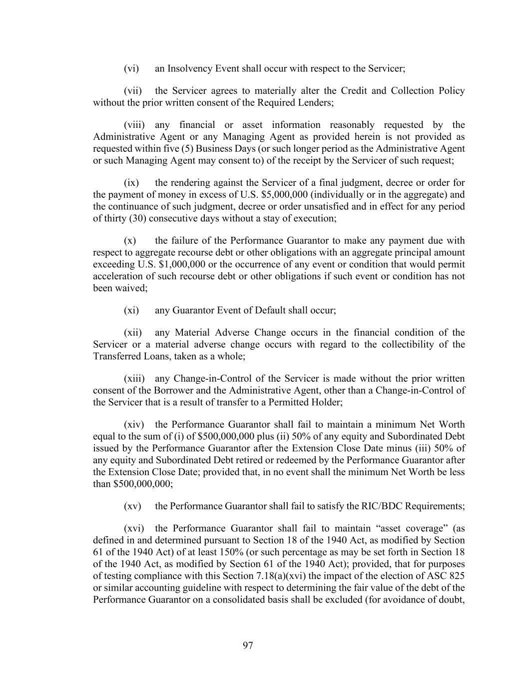 97 (vi) an Insolvency Event shall occur with respect to the Servicer; (vii) the Servicer agrees to materially alter the Credit and Collection Policy without the prior written consent of the Required Lenders; (viii) any financial or asset information reasonably requested by the Administrative Agent or any Managing Agent as provided herein is not provided as requested within five (5) Business Days (or such longer period as the Administrative Agent or such Managing Agent may consent to) of the receipt by the Servicer of such request; (ix) the rendering against the Servicer of a final judgment, decree or order for the payment of money in excess of U.S. $5,000,000 (individually or in the aggregate) and the continuance of such judgment, decree or order unsatisfied and in effect for any period of thirty (30) consecutive days without a stay of execution; (x) the failure of the Performance Guarantor to make any payment due with respect to aggregate recourse debt or other obligations with an aggregate principal amount exceeding U.S. $1,000,000 or the occurrence of any event or condition that would permit acceleration of such recourse debt or other obligations if such event or condition has not been waived; (xi) any Guarantor Event of Default shall occur; (xii) any Material Adverse Change occurs in the financial condition of the Servicer or a material adverse change occurs with regard to the collectibility of the Transferred Loans, taken as a whole; (xiii) any Change-in-Control of the Servicer is made without the prior written consent of the Borrower and the Administrative Agent, other than a Change-in-Control of the Servicer that is a result of transfer to a Permitted Holder; (xiv) the Performance Guarantor shall fail to maintain a minimum Net Worth equal to the sum of (i) of $500,000,000 plus (ii) 50% of any equity and Subordinated Debt issued by the Performance Guarantor after the Extension Close Date minus (iii) 50% of any equity and Subordinated Debt retired or redeemed by the Performance Guarantor after the Extension Close Date; provided that, in no event shall the minimum Net Worth be less than $500,000,000; (xv) the Performance Guarantor shall fail to satisfy the RIC/BDC Requirements; (xvi) the Performance Guarantor shall fail to maintain “asset coverage” (as defined in and determined pursuant to Section 18 of the 1940 Act, as modified by Section 61 of the 1940 Act) of at least 150% (or such percentage as may be set forth in Section 18 of the 1940 Act, as modified by Section 61 of the 1940 Act); provided, that for purposes of testing compliance with this Section 7.18(a)(xvi) the impact of the election of ASC 825 or similar accounting guideline with respect to determining the fair value of the debt of the Performance Guarantor on a consolidated basis shall be excluded (for avoidance of doubt,