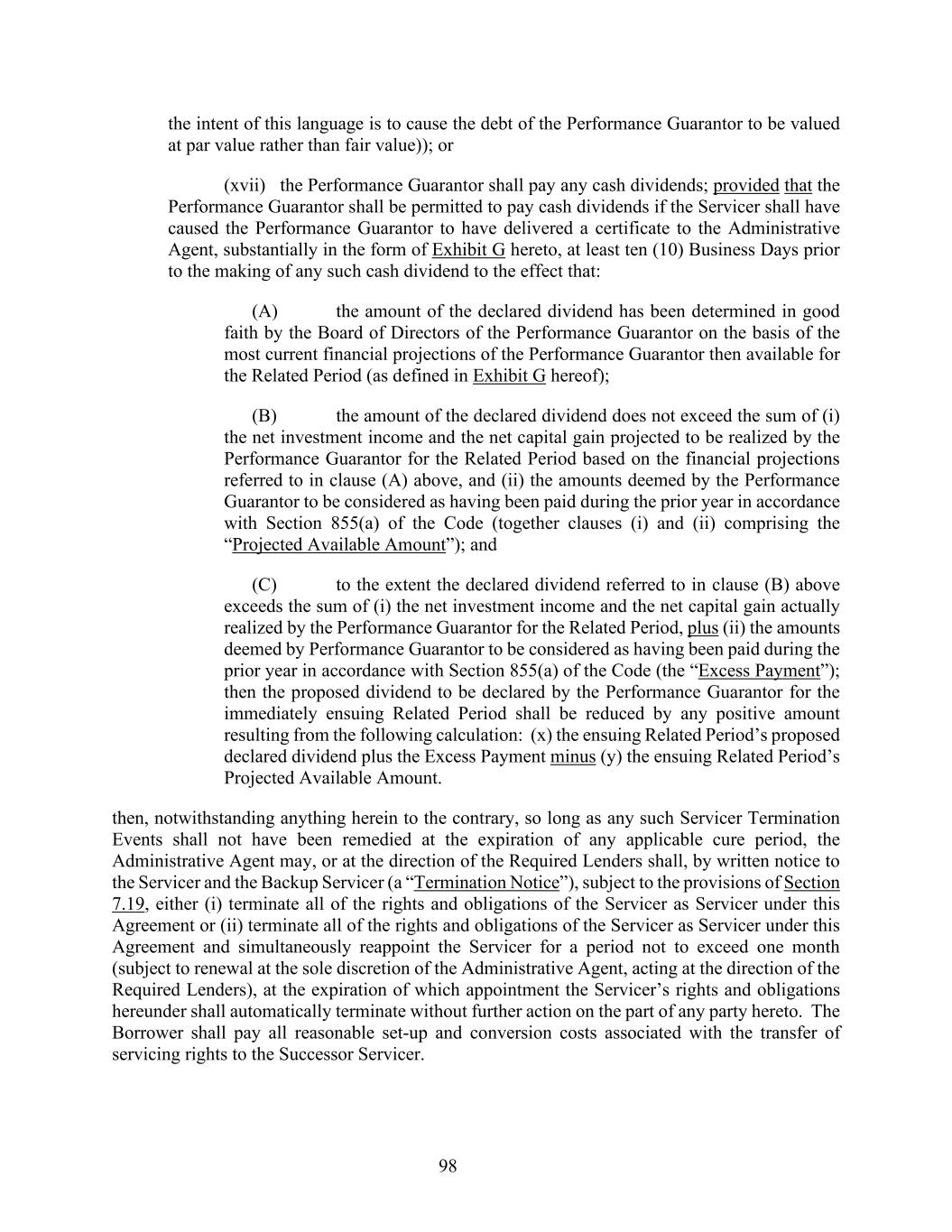 98 the intent of this language is to cause the debt of the Performance Guarantor to be valued at par value rather than fair value)); or (xvii) the Performance Guarantor shall pay any cash dividends; provided that the Performance Guarantor shall be permitted to pay cash dividends if the Servicer shall have caused the Performance Guarantor to have delivered a certificate to the Administrative Agent, substantially in the form of Exhibit G hereto, at least ten (10) Business Days prior to the making of any such cash dividend to the effect that: (A) the amount of the declared dividend has been determined in good faith by the Board of Directors of the Performance Guarantor on the basis of the most current financial projections of the Performance Guarantor then available for the Related Period (as defined in Exhibit G hereof); (B) the amount of the declared dividend does not exceed the sum of (i) the net investment income and the net capital gain projected to be realized by the Performance Guarantor for the Related Period based on the financial projections referred to in clause (A) above, and (ii) the amounts deemed by the Performance Guarantor to be considered as having been paid during the prior year in accordance with Section 855(a) of the Code (together clauses (i) and (ii) comprising the “Projected Available Amount”); and (C) to the extent the declared dividend referred to in clause (B) above exceeds the sum of (i) the net investment income and the net capital gain actually realized by the Performance Guarantor for the Related Period, plus (ii) the amounts deemed by Performance Guarantor to be considered as having been paid during the prior year in accordance with Section 855(a) of the Code (the “Excess Payment”); then the proposed dividend to be declared by the Performance Guarantor for the immediately ensuing Related Period shall be reduced by any positive amount resulting from the following calculation: (x) the ensuing Related Period’s proposed declared dividend plus the Excess Payment minus (y) the ensuing Related Period’s Projected Available Amount. then, notwithstanding anything herein to the contrary, so long as any such Servicer Termination Events shall not have been remedied at the expiration of any applicable cure period, the Administrative Agent may, or at the direction of the Required Lenders shall, by written notice to the Servicer and the Backup Servicer (a “Termination Notice”), subject to the provisions of Section 7.19, either (i) terminate all of the rights and obligations of the Servicer as Servicer under this Agreement or (ii) terminate all of the rights and obligations of the Servicer as Servicer under this Agreement and simultaneously reappoint the Servicer for a period not to exceed one month (subject to renewal at the sole discretion of the Administrative Agent, acting at the direction of the Required Lenders), at the expiration of which appointment the Servicer’s rights and obligations hereunder shall automatically terminate without further action on the part of any party hereto. The Borrower shall pay all reasonable set-up and conversion costs associated with the transfer of servicing rights to the Successor Servicer.