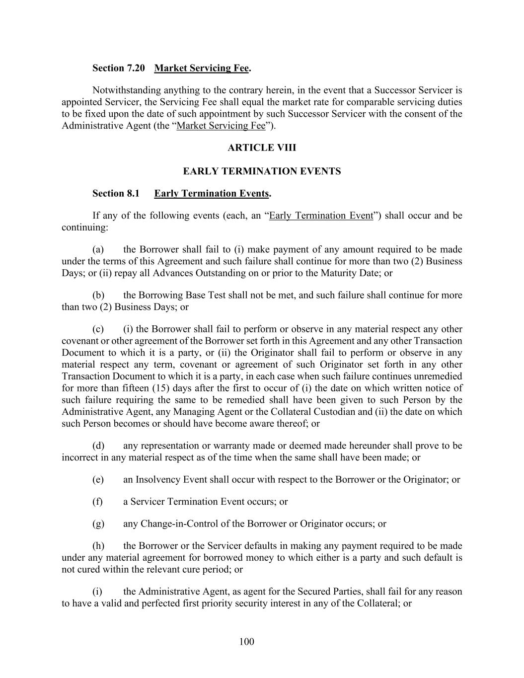 100 Section 7.20 Market Servicing Fee. Notwithstanding anything to the contrary herein, in the event that a Successor Servicer is appointed Servicer, the Servicing Fee shall equal the market rate for comparable servicing duties to be fixed upon the date of such appointment by such Successor Servicer with the consent of the Administrative Agent (the “Market Servicing Fee”). ARTICLE VIII EARLY TERMINATION EVENTS Section 8.1 Early Termination Events. If any of the following events (each, an “Early Termination Event”) shall occur and be continuing: (a) the Borrower shall fail to (i) make payment of any amount required to be made under the terms of this Agreement and such failure shall continue for more than two (2) Business Days; or (ii) repay all Advances Outstanding on or prior to the Maturity Date; or (b) the Borrowing Base Test shall not be met, and such failure shall continue for more than two (2) Business Days; or (c) (i) the Borrower shall fail to perform or observe in any material respect any other covenant or other agreement of the Borrower set forth in this Agreement and any other Transaction Document to which it is a party, or (ii) the Originator shall fail to perform or observe in any material respect any term, covenant or agreement of such Originator set forth in any other Transaction Document to which it is a party, in each case when such failure continues unremedied for more than fifteen (15) days after the first to occur of (i) the date on which written notice of such failure requiring the same to be remedied shall have been given to such Person by the Administrative Agent, any Managing Agent or the Collateral Custodian and (ii) the date on which such Person becomes or should have become aware thereof; or (d) any representation or warranty made or deemed made hereunder shall prove to be incorrect in any material respect as of the time when the same shall have been made; or (e) an Insolvency Event shall occur with respect to the Borrower or the Originator; or (f) a Servicer Termination Event occurs; or (g) any Change-in-Control of the Borrower or Originator occurs; or (h) the Borrower or the Servicer defaults in making any payment required to be made under any material agreement for borrowed money to which either is a party and such default is not cured within the relevant cure period; or (i) the Administrative Agent, as agent for the Secured Parties, shall fail for any reason to have a valid and perfected first priority security interest in any of the Collateral; or