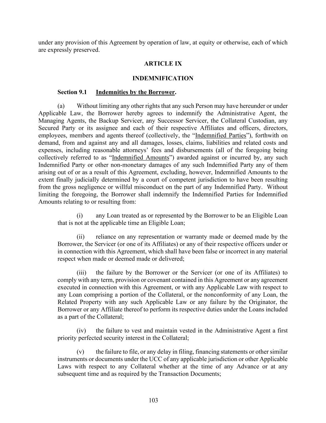 103 under any provision of this Agreement by operation of law, at equity or otherwise, each of which are expressly preserved. ARTICLE IX INDEMNIFICATION Section 9.1 Indemnities by the Borrower. (a) Without limiting any other rights that any such Person may have hereunder or under Applicable Law, the Borrower hereby agrees to indemnify the Administrative Agent, the Managing Agents, the Backup Servicer, any Successor Servicer, the Collateral Custodian, any Secured Party or its assignee and each of their respective Affiliates and officers, directors, employees, members and agents thereof (collectively, the “Indemnified Parties”), forthwith on demand, from and against any and all damages, losses, claims, liabilities and related costs and expenses, including reasonable attorneys’ fees and disbursements (all of the foregoing being collectively referred to as “Indemnified Amounts”) awarded against or incurred by, any such Indemnified Party or other non-monetary damages of any such Indemnified Party any of them arising out of or as a result of this Agreement, excluding, however, Indemnified Amounts to the extent finally judicially determined by a court of competent jurisdiction to have been resulting from the gross negligence or willful misconduct on the part of any Indemnified Party. Without limiting the foregoing, the Borrower shall indemnify the Indemnified Parties for Indemnified Amounts relating to or resulting from: (i) any Loan treated as or represented by the Borrower to be an Eligible Loan that is not at the applicable time an Eligible Loan; (ii) reliance on any representation or warranty made or deemed made by the Borrower, the Servicer (or one of its Affiliates) or any of their respective officers under or in connection with this Agreement, which shall have been false or incorrect in any material respect when made or deemed made or delivered; (iii) the failure by the Borrower or the Servicer (or one of its Affiliates) to comply with any term, provision or covenant contained in this Agreement or any agreement executed in connection with this Agreement, or with any Applicable Law with respect to any Loan comprising a portion of the Collateral, or the nonconformity of any Loan, the Related Property with any such Applicable Law or any failure by the Originator, the Borrower or any Affiliate thereof to perform its respective duties under the Loans included as a part of the Collateral; (iv) the failure to vest and maintain vested in the Administrative Agent a first priority perfected security interest in the Collateral; (v) the failure to file, or any delay in filing, financing statements or other similar instruments or documents under the UCC of any applicable jurisdiction or other Applicable Laws with respect to any Collateral whether at the time of any Advance or at any subsequent time and as required by the Transaction Documents;
