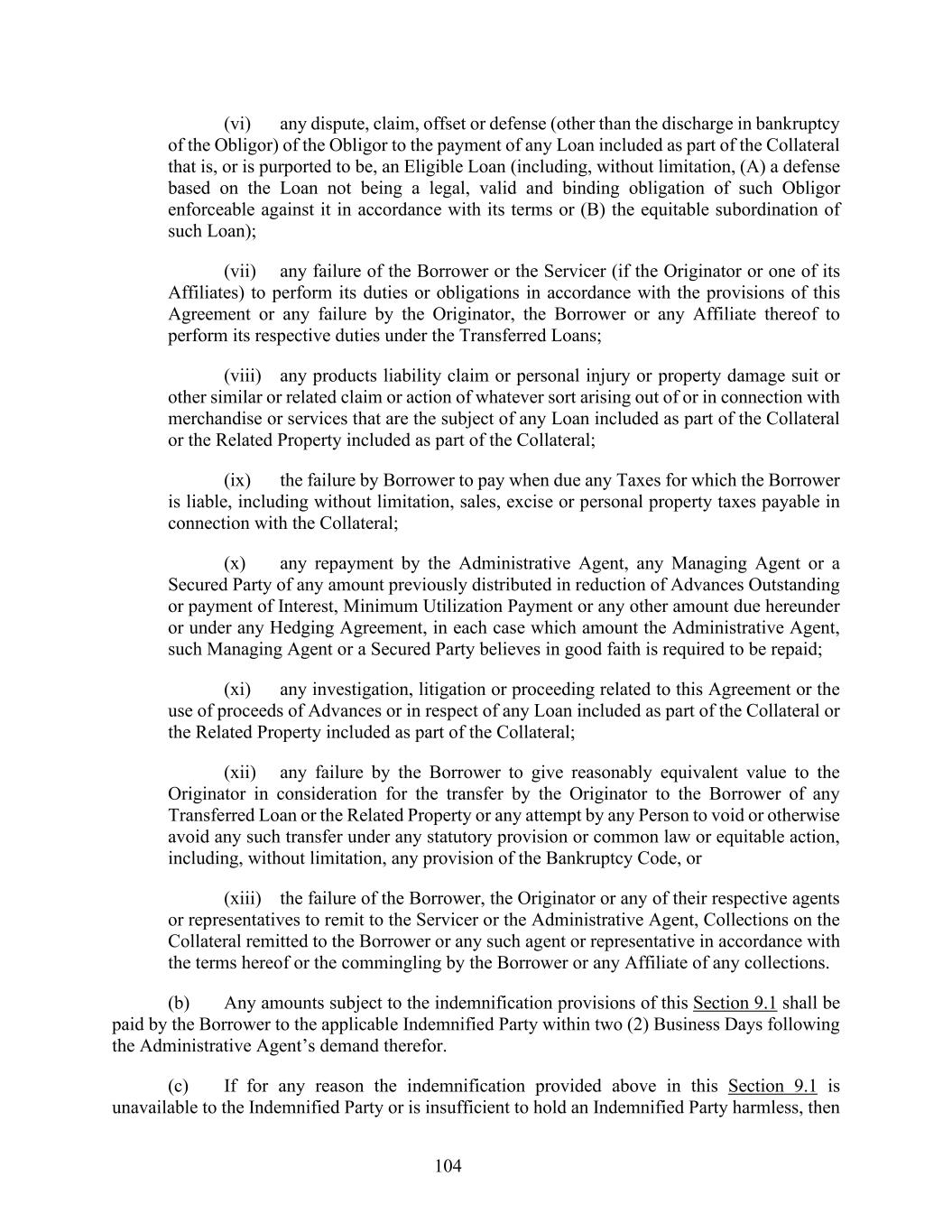 104 (vi) any dispute, claim, offset or defense (other than the discharge in bankruptcy of the Obligor) of the Obligor to the payment of any Loan included as part of the Collateral that is, or is purported to be, an Eligible Loan (including, without limitation, (A) a defense based on the Loan not being a legal, valid and binding obligation of such Obligor enforceable against it in accordance with its terms or (B) the equitable subordination of such Loan); (vii) any failure of the Borrower or the Servicer (if the Originator or one of its Affiliates) to perform its duties or obligations in accordance with the provisions of this Agreement or any failure by the Originator, the Borrower or any Affiliate thereof to perform its respective duties under the Transferred Loans; (viii) any products liability claim or personal injury or property damage suit or other similar or related claim or action of whatever sort arising out of or in connection with merchandise or services that are the subject of any Loan included as part of the Collateral or the Related Property included as part of the Collateral; (ix) the failure by Borrower to pay when due any Taxes for which the Borrower is liable, including without limitation, sales, excise or personal property taxes payable in connection with the Collateral; (x) any repayment by the Administrative Agent, any Managing Agent or a Secured Party of any amount previously distributed in reduction of Advances Outstanding or payment of Interest, Minimum Utilization Payment or any other amount due hereunder or under any Hedging Agreement, in each case which amount the Administrative Agent, such Managing Agent or a Secured Party believes in good faith is required to be repaid; (xi) any investigation, litigation or proceeding related to this Agreement or the use of proceeds of Advances or in respect of any Loan included as part of the Collateral or the Related Property included as part of the Collateral; (xii) any failure by the Borrower to give reasonably equivalent value to the Originator in consideration for the transfer by the Originator to the Borrower of any Transferred Loan or the Related Property or any attempt by any Person to void or otherwise avoid any such transfer under any statutory provision or common law or equitable action, including, without limitation, any provision of the Bankruptcy Code, or (xiii) the failure of the Borrower, the Originator or any of their respective agents or representatives to remit to the Servicer or the Administrative Agent, Collections on the Collateral remitted to the Borrower or any such agent or representative in accordance with the terms hereof or the commingling by the Borrower or any Affiliate of any collections. (b) Any amounts subject to the indemnification provisions of this Section 9.1 shall be paid by the Borrower to the applicable Indemnified Party within two (2) Business Days following the Administrative Agent’s demand therefor. (c) If for any reason the indemnification provided above in this Section 9.1 is unavailable to the Indemnified Party or is insufficient to hold an Indemnified Party harmless, then