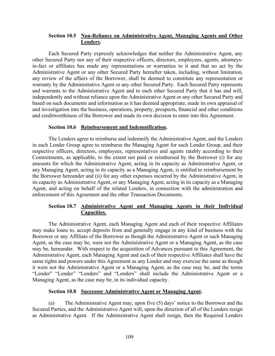 109 Section 10.5 Non-Reliance on Administrative Agent, Managing Agents and Other Lenders. Each Secured Party expressly acknowledges that neither the Administrative Agent, any other Secured Party nor any of their respective officers, directors, employees, agents, attorneys- in-fact or affiliates has made any representations or warranties to it and that no act by the Administrative Agent or any other Secured Party hereafter taken, including, without limitation, any review of the affairs of the Borrower, shall be deemed to constitute any representation or warranty by the Administrative Agent or any other Secured Party. Each Secured Party represents and warrants to the Administrative Agent and to each other Secured Party that it has and will, independently and without reliance upon the Administrative Agent or any other Secured Party and based on such documents and information as it has deemed appropriate, made its own appraisal of and investigation into the business, operations, property, prospects, financial and other conditions and creditworthiness of the Borrower and made its own decision to enter into this Agreement. Section 10.6 Reimbursement and Indemnification. The Lenders agree to reimburse and indemnify the Administrative Agent, and the Lenders in each Lender Group agree to reimburse the Managing Agent for such Lender Group, and their respective officers, directors, employees, representatives and agents ratably according to their Commitments, as applicable, to the extent not paid or reimbursed by the Borrower (i) for any amounts for which the Administrative Agent, acting in its capacity as Administrative Agent, or any Managing Agent, acting in its capacity as a Managing Agent, is entitled to reimbursement by the Borrower hereunder and (ii) for any other expenses incurred by the Administrative Agent, in its capacity as Administrative Agent, or any Managing Agent, acting in its capacity as a Managing Agent, and acting on behalf of the related Lenders, in connection with the administration and enforcement of this Agreement and the other Transaction Documents. Section 10.7 Administrative Agent and Managing Agents in their Individual Capacities. The Administrative Agent, each Managing Agent and each of their respective Affiliates may make loans to, accept deposits from and generally engage in any kind of business with the Borrower or any Affiliate of the Borrower as though the Administrative Agent or such Managing Agent, as the case may be, were not the Administrative Agent or a Managing Agent, as the case may be, hereunder. With respect to the acquisition of Advances pursuant to this Agreement, the Administrative Agent, each Managing Agent and each of their respective Affiliates shall have the same rights and powers under this Agreement as any Lender and may exercise the same as though it were not the Administrative Agent or a Managing Agent, as the case may be, and the terms “Lender” “Lender” “Lenders” and “Lenders” shall include the Administrative Agent or a Managing Agent, as the case may be, in its individual capacity. Section 10.8 Successor Administrative Agent or Managing Agent. (a) The Administrative Agent may, upon five (5) days’ notice to the Borrower and the Secured Parties, and the Administrative Agent will, upon the direction of all of the Lenders resign as Administrative Agent. If the Administrative Agent shall resign, then the Required Lenders