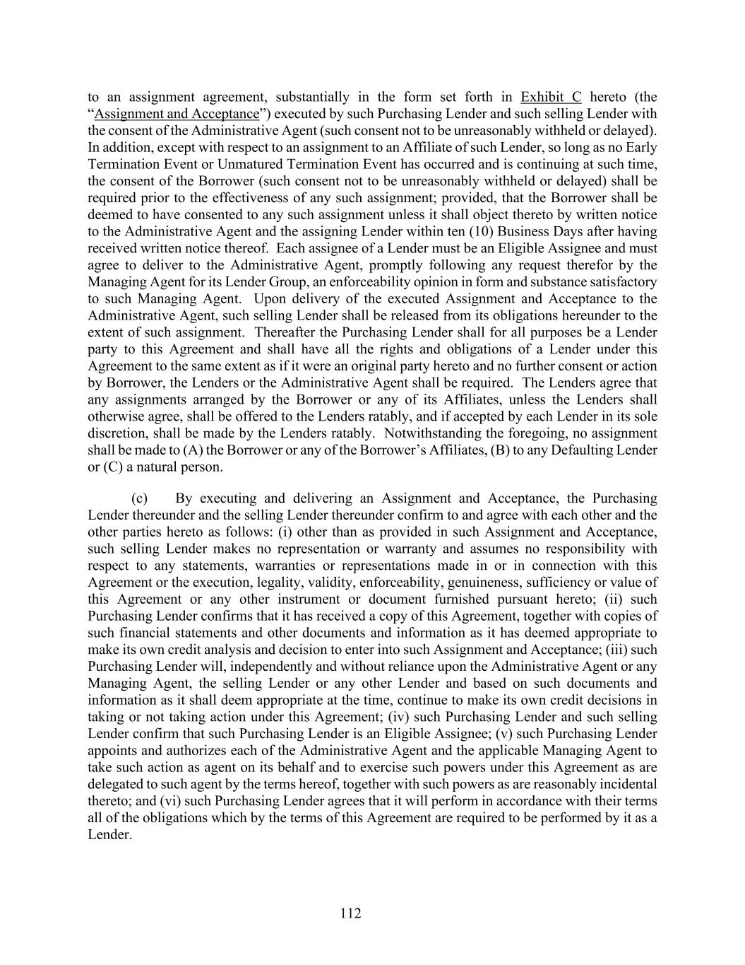 112 to an assignment agreement, substantially in the form set forth in Exhibit C hereto (the “Assignment and Acceptance”) executed by such Purchasing Lender and such selling Lender with the consent of the Administrative Agent (such consent not to be unreasonably withheld or delayed). In addition, except with respect to an assignment to an Affiliate of such Lender, so long as no Early Termination Event or Unmatured Termination Event has occurred and is continuing at such time, the consent of the Borrower (such consent not to be unreasonably withheld or delayed) shall be required prior to the effectiveness of any such assignment; provided, that the Borrower shall be deemed to have consented to any such assignment unless it shall object thereto by written notice to the Administrative Agent and the assigning Lender within ten (10) Business Days after having received written notice thereof. Each assignee of a Lender must be an Eligible Assignee and must agree to deliver to the Administrative Agent, promptly following any request therefor by the Managing Agent for its Lender Group, an enforceability opinion in form and substance satisfactory to such Managing Agent. Upon delivery of the executed Assignment and Acceptance to the Administrative Agent, such selling Lender shall be released from its obligations hereunder to the extent of such assignment. Thereafter the Purchasing Lender shall for all purposes be a Lender party to this Agreement and shall have all the rights and obligations of a Lender under this Agreement to the same extent as if it were an original party hereto and no further consent or action by Borrower, the Lenders or the Administrative Agent shall be required. The Lenders agree that any assignments arranged by the Borrower or any of its Affiliates, unless the Lenders shall otherwise agree, shall be offered to the Lenders ratably, and if accepted by each Lender in its sole discretion, shall be made by the Lenders ratably. Notwithstanding the foregoing, no assignment shall be made to (A) the Borrower or any of the Borrower’s Affiliates, (B) to any Defaulting Lender or (C) a natural person. (c) By executing and delivering an Assignment and Acceptance, the Purchasing Lender thereunder and the selling Lender thereunder confirm to and agree with each other and the other parties hereto as follows: (i) other than as provided in such Assignment and Acceptance, such selling Lender makes no representation or warranty and assumes no responsibility with respect to any statements, warranties or representations made in or in connection with this Agreement or the execution, legality, validity, enforceability, genuineness, sufficiency or value of this Agreement or any other instrument or document furnished pursuant hereto; (ii) such Purchasing Lender confirms that it has received a copy of this Agreement, together with copies of such financial statements and other documents and information as it has deemed appropriate to make its own credit analysis and decision to enter into such Assignment and Acceptance; (iii) such Purchasing Lender will, independently and without reliance upon the Administrative Agent or any Managing Agent, the selling Lender or any other Lender and based on such documents and information as it shall deem appropriate at the time, continue to make its own credit decisions in taking or not taking action under this Agreement; (iv) such Purchasing Lender and such selling Lender confirm that such Purchasing Lender is an Eligible Assignee; (v) such Purchasing Lender appoints and authorizes each of the Administrative Agent and the applicable Managing Agent to take such action as agent on its behalf and to exercise such powers under this Agreement as are delegated to such agent by the terms hereof, together with such powers as are reasonably incidental thereto; and (vi) such Purchasing Lender agrees that it will perform in accordance with their terms all of the obligations which by the terms of this Agreement are required to be performed by it as a Lender.
