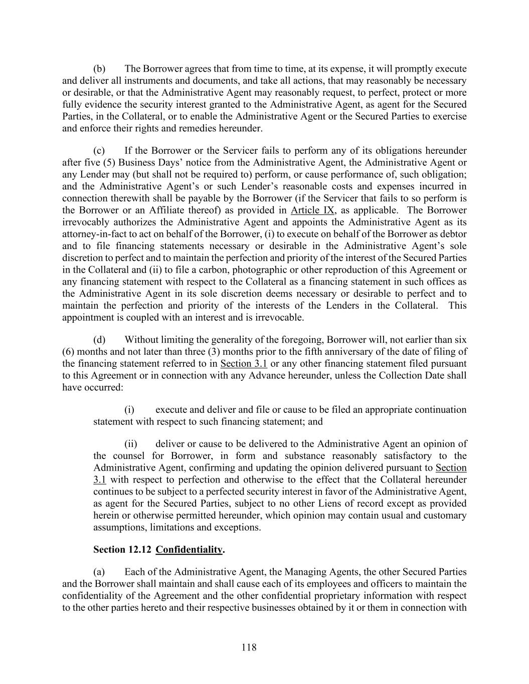 118 (b) The Borrower agrees that from time to time, at its expense, it will promptly execute and deliver all instruments and documents, and take all actions, that may reasonably be necessary or desirable, or that the Administrative Agent may reasonably request, to perfect, protect or more fully evidence the security interest granted to the Administrative Agent, as agent for the Secured Parties, in the Collateral, or to enable the Administrative Agent or the Secured Parties to exercise and enforce their rights and remedies hereunder. (c) If the Borrower or the Servicer fails to perform any of its obligations hereunder after five (5) Business Days’ notice from the Administrative Agent, the Administrative Agent or any Lender may (but shall not be required to) perform, or cause performance of, such obligation; and the Administrative Agent’s or such Lender’s reasonable costs and expenses incurred in connection therewith shall be payable by the Borrower (if the Servicer that fails to so perform is the Borrower or an Affiliate thereof) as provided in Article IX, as applicable. The Borrower irrevocably authorizes the Administrative Agent and appoints the Administrative Agent as its attorney-in-fact to act on behalf of the Borrower, (i) to execute on behalf of the Borrower as debtor and to file financing statements necessary or desirable in the Administrative Agent’s sole discretion to perfect and to maintain the perfection and priority of the interest of the Secured Parties in the Collateral and (ii) to file a carbon, photographic or other reproduction of this Agreement or any financing statement with respect to the Collateral as a financing statement in such offices as the Administrative Agent in its sole discretion deems necessary or desirable to perfect and to maintain the perfection and priority of the interests of the Lenders in the Collateral. This appointment is coupled with an interest and is irrevocable. (d) Without limiting the generality of the foregoing, Borrower will, not earlier than six (6) months and not later than three (3) months prior to the fifth anniversary of the date of filing of the financing statement referred to in Section 3.1 or any other financing statement filed pursuant to this Agreement or in connection with any Advance hereunder, unless the Collection Date shall have occurred: (i) execute and deliver and file or cause to be filed an appropriate continuation statement with respect to such financing statement; and (ii) deliver or cause to be delivered to the Administrative Agent an opinion of the counsel for Borrower, in form and substance reasonably satisfactory to the Administrative Agent, confirming and updating the opinion delivered pursuant to Section 3.1 with respect to perfection and otherwise to the effect that the Collateral hereunder continues to be subject to a perfected security interest in favor of the Administrative Agent, as agent for the Secured Parties, subject to no other Liens of record except as provided herein or otherwise permitted hereunder, which opinion may contain usual and customary assumptions, limitations and exceptions. Section 12.12 Confidentiality. (a) Each of the Administrative Agent, the Managing Agents, the other Secured Parties and the Borrower shall maintain and shall cause each of its employees and officers to maintain the confidentiality of the Agreement and the other confidential proprietary information with respect to the other parties hereto and their respective businesses obtained by it or them in connection with