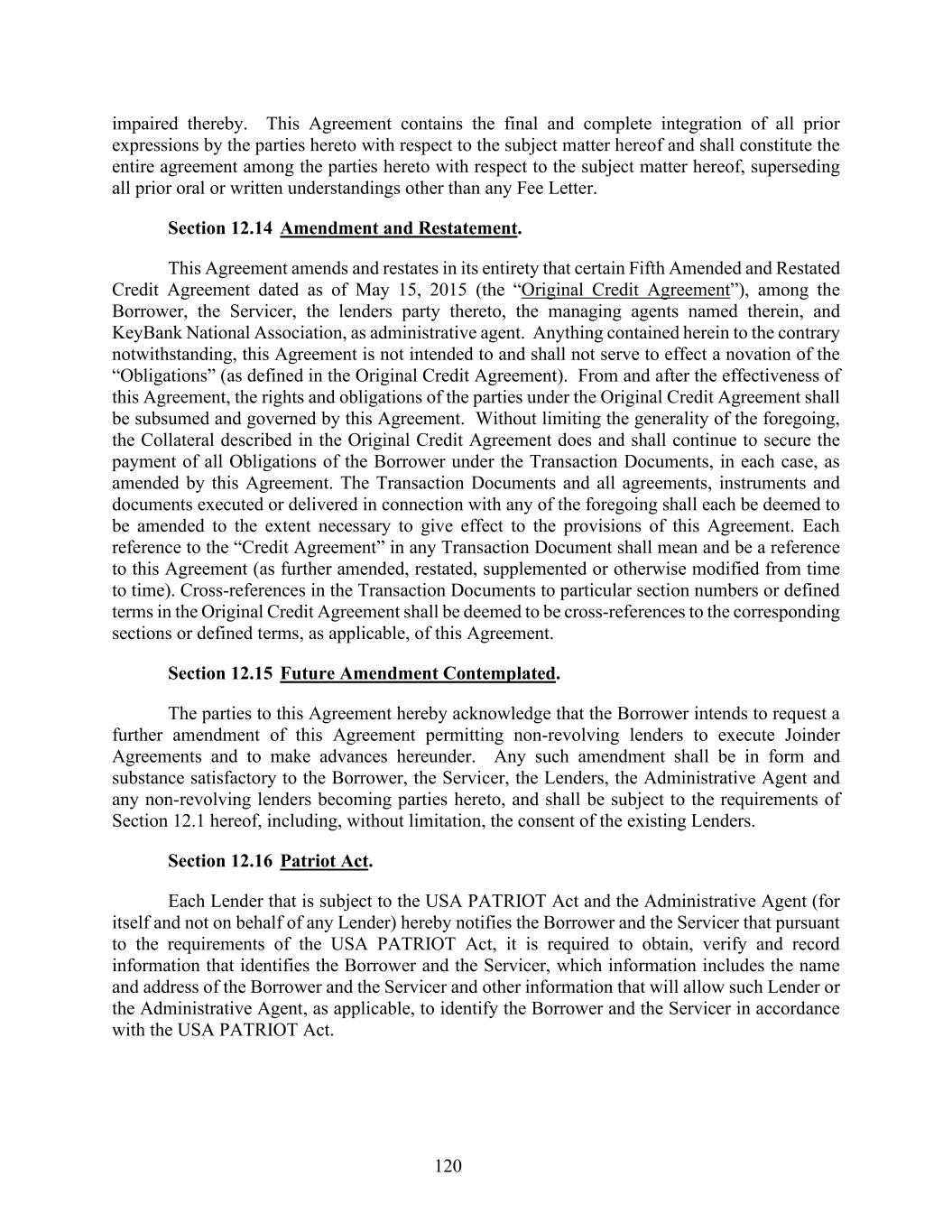 120 impaired thereby. This Agreement contains the final and complete integration of all prior expressions by the parties hereto with respect to the subject matter hereof and shall constitute the entire agreement among the parties hereto with respect to the subject matter hereof, superseding all prior oral or written understandings other than any Fee Letter. Section 12.14 Amendment and Restatement. This Agreement amends and restates in its entirety that certain Fifth Amended and Restated Credit Agreement dated as of May 15, 2015 (the “Original Credit Agreement”), among the Borrower, the Servicer, the lenders party thereto, the managing agents named therein, and KeyBank National Association, as administrative agent. Anything contained herein to the contrary notwithstanding, this Agreement is not intended to and shall not serve to effect a novation of the “Obligations” (as defined in the Original Credit Agreement). From and after the effectiveness of this Agreement, the rights and obligations of the parties under the Original Credit Agreement shall be subsumed and governed by this Agreement. Without limiting the generality of the foregoing, the Collateral described in the Original Credit Agreement does and shall continue to secure the payment of all Obligations of the Borrower under the Transaction Documents, in each case, as amended by this Agreement. The Transaction Documents and all agreements, instruments and documents executed or delivered in connection with any of the foregoing shall each be deemed to be amended to the extent necessary to give effect to the provisions of this Agreement. Each reference to the “Credit Agreement” in any Transaction Document shall mean and be a reference to this Agreement (as further amended, restated, supplemented or otherwise modified from time to time). Cross-references in the Transaction Documents to particular section numbers or defined terms in the Original Credit Agreement shall be deemed to be cross-references to the corresponding sections or defined terms, as applicable, of this Agreement. Section 12.15 Future Amendment Contemplated. The parties to this Agreement hereby acknowledge that the Borrower intends to request a further amendment of this Agreement permitting non-revolving lenders to execute Joinder Agreements and to make advances hereunder. Any such amendment shall be in form and substance satisfactory to the Borrower, the Servicer, the Lenders, the Administrative Agent and any non-revolving lenders becoming parties hereto, and shall be subject to the requirements of Section 12.1 hereof, including, without limitation, the consent of the existing Lenders. Section 12.16 Patriot Act. Each Lender that is subject to the USA PATRIOT Act and the Administrative Agent (for itself and not on behalf of any Lender) hereby notifies the Borrower and the Servicer that pursuant to the requirements of the USA PATRIOT Act, it is required to obtain, verify and record information that identifies the Borrower and the Servicer, which information includes the name and address of the Borrower and the Servicer and other information that will allow such Lender or the Administrative Agent, as applicable, to identify the Borrower and the Servicer in accordance with the USA PATRIOT Act.