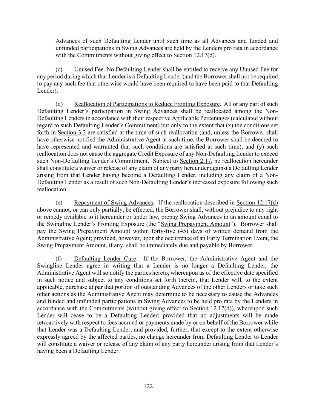 122 Advances of such Defaulting Lender until such time as all Advances and funded and unfunded participations in Swing Advances are held by the Lenders pro rata in accordance with the Commitments without giving effect to Section 12.17(d). (c) Unused Fee. No Defaulting Lender shall be entitled to receive any Unused Fee for any period during which that Lender is a Defaulting Lender (and the Borrower shall not be required to pay any such fee that otherwise would have been required to have been paid to that Defaulting Lender). (d) Reallocation of Participations to Reduce Fronting Exposure. All or any part of such Defaulting Lender’s participation in Swing Advances shall be reallocated among the Non- Defaulting Lenders in accordance with their respective Applicable Percentages (calculated without regard to such Defaulting Lender’s Commitment) but only to the extent that (x) the conditions set forth in Section 3.2 are satisfied at the time of such reallocation (and, unless the Borrower shall have otherwise notified the Administrative Agent at such time, the Borrower shall be deemed to have represented and warranted that such conditions are satisfied at such time), and (y) such reallocation does not cause the aggregate Credit Exposure of any Non-Defaulting Lender to exceed such Non-Defaulting Lender’s Commitment. Subject to Section 2.17, no reallocation hereunder shall constitute a waiver or release of any claim of any party hereunder against a Defaulting Lender arising from that Lender having become a Defaulting Lender, including any claim of a Non- Defaulting Lender as a result of such Non-Defaulting Lender’s increased exposure following such reallocation. (e) Repayment of Swing Advances. If the reallocation described in Section 12.17(d) above cannot, or can only partially, be effected, the Borrower shall, without prejudice to any right or remedy available to it hereunder or under law, prepay Swing Advances in an amount equal to the Swingline Lender’s Fronting Exposure (the “Swing Prepayment Amount”). Borrower shall pay the Swing Prepayment Amount within forty-five (45) days of written demand from the Administrative Agent; provided, however, upon the occurrence of an Early Termination Event, the Swing Prepayment Amount, if any, shall be immediately due and payable by Borrower. (f) Defaulting Lender Cure. If the Borrower, the Administrative Agent and the Swingline Lender agree in writing that a Lender is no longer a Defaulting Lender, the Administrative Agent will so notify the parties hereto, whereupon as of the effective date specified in such notice and subject to any conditions set forth therein, that Lender will, to the extent applicable, purchase at par that portion of outstanding Advances of the other Lenders or take such other actions as the Administrative Agent may determine to be necessary to cause the Advances and funded and unfunded participations in Swing Advances to be held pro rata by the Lenders in accordance with the Commitments (without giving effect to Section 12.17(d)), whereupon such Lender will cease to be a Defaulting Lender; provided that no adjustments will be made retroactively with respect to fees accrued or payments made by or on behalf of the Borrower while that Lender was a Defaulting Lender; and provided, further, that except to the extent otherwise expressly agreed by the affected parties, no change hereunder from Defaulting Lender to Lender will constitute a waiver or release of any claim of any party hereunder arising from that Lender’s having been a Defaulting Lender.