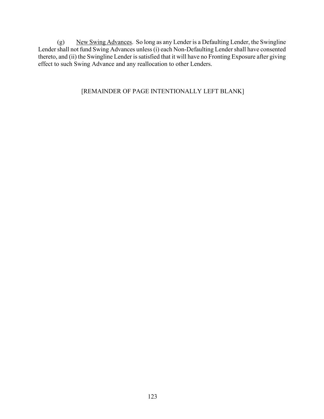 123 (g) New Swing Advances. So long as any Lender is a Defaulting Lender, the Swingline Lender shall not fund Swing Advances unless (i) each Non-Defaulting Lender shall have consented thereto, and (ii) the Swingline Lender is satisfied that it will have no Fronting Exposure after giving effect to such Swing Advance and any reallocation to other Lenders. [REMAINDER OF PAGE INTENTIONALLY LEFT BLANK]