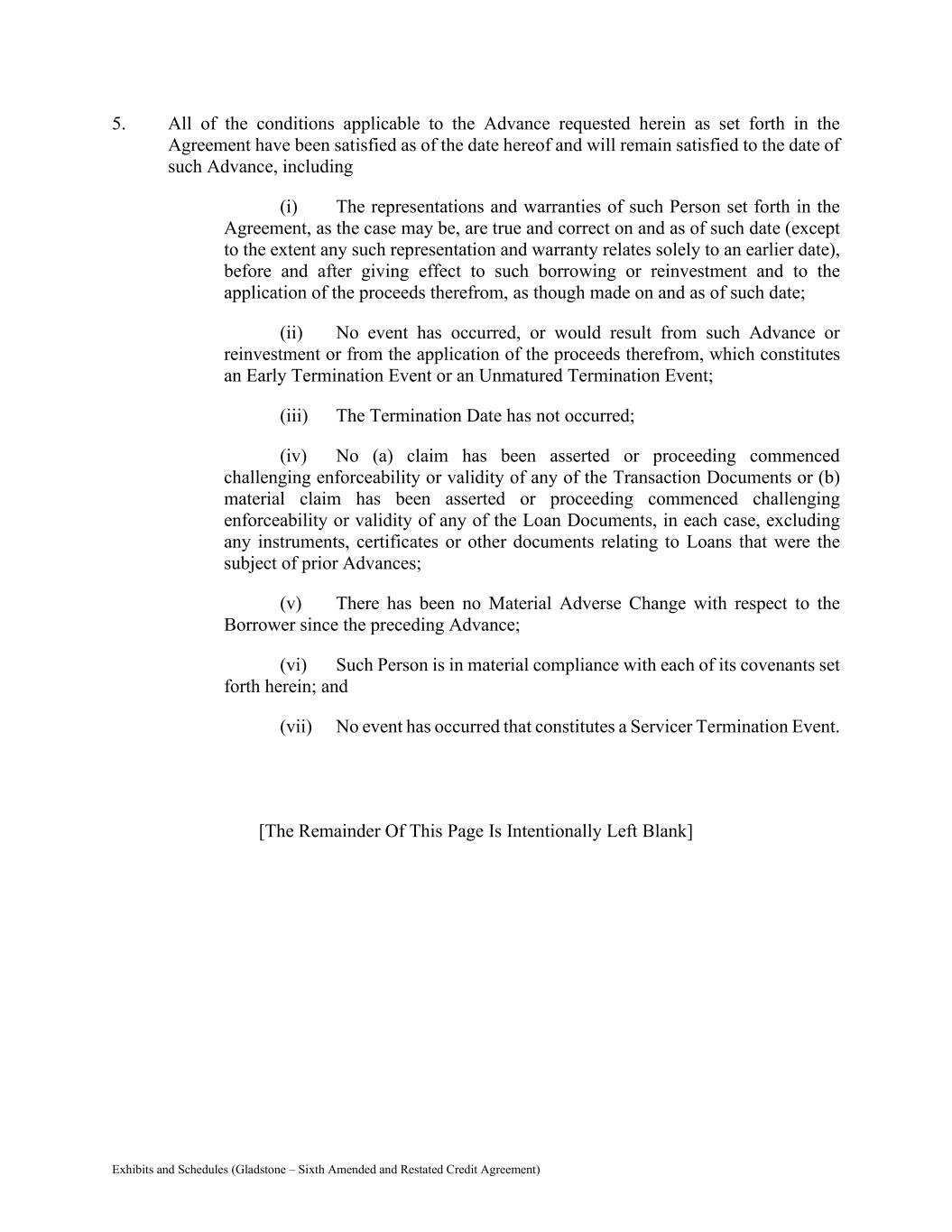 Exhibits and Schedules (Gladstone – Sixth Amended and Restated Credit Agreement) 5. All of the conditions applicable to the Advance requested herein as set forth in the Agreement have been satisfied as of the date hereof and will remain satisfied to the date of such Advance, including (i) The representations and warranties of such Person set forth in the Agreement, as the case may be, are true and correct on and as of such date (except to the extent any such representation and warranty relates solely to an earlier date), before and after giving effect to such borrowing or reinvestment and to the application of the proceeds therefrom, as though made on and as of such date; (ii) No event has occurred, or would result from such Advance or reinvestment or from the application of the proceeds therefrom, which constitutes an Early Termination Event or an Unmatured Termination Event; (iii) The Termination Date has not occurred; (iv) No (a) claim has been asserted or proceeding commenced challenging enforceability or validity of any of the Transaction Documents or (b) material claim has been asserted or proceeding commenced challenging enforceability or validity of any of the Loan Documents, in each case, excluding any instruments, certificates or other documents relating to Loans that were the subject of prior Advances; (v) There has been no Material Adverse Change with respect to the Borrower since the preceding Advance; (vi) Such Person is in material compliance with each of its covenants set forth herein; and (vii) No event has occurred that constitutes a Servicer Termination Event. [The Remainder Of This Page Is Intentionally Left Blank]