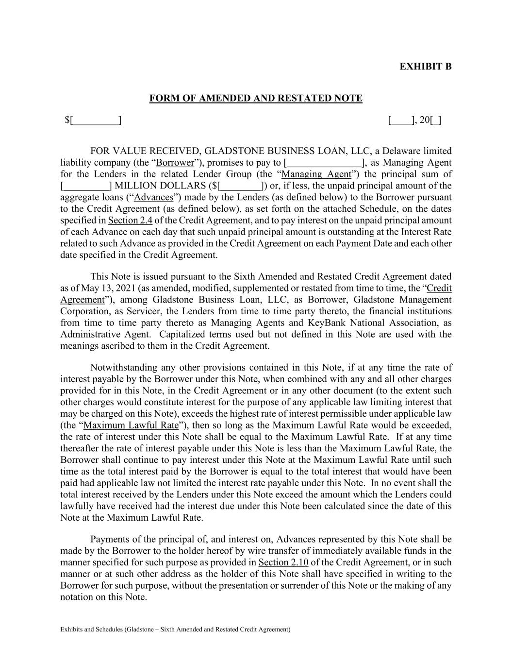 Exhibits and Schedules (Gladstone – Sixth Amended and Restated Credit Agreement) EXHIBIT B FORM OF AMENDED AND RESTATED NOTE $[_________] [ ], 20[ ] FOR VALUE RECEIVED, GLADSTONE BUSINESS LOAN, LLC, a Delaware limited liability company (the “Borrower”), promises to pay to [ ], as Managing Agent for the Lenders in the related Lender Group (the “Managing Agent”) the principal sum of [_________] MILLION DOLLARS ($[________]) or, if less, the unpaid principal amount of the aggregate loans (“Advances”) made by the Lenders (as defined below) to the Borrower pursuant to the Credit Agreement (as defined below), as set forth on the attached Schedule, on the dates specified in Section 2.4 of the Credit Agreement, and to pay interest on the unpaid principal amount of each Advance on each day that such unpaid principal amount is outstanding at the Interest Rate related to such Advance as provided in the Credit Agreement on each Payment Date and each other date specified in the Credit Agreement. This Note is issued pursuant to the Sixth Amended and Restated Credit Agreement dated as of May 13, 2021 (as amended, modified, supplemented or restated from time to time, the “Credit Agreement”), among Gladstone Business Loan, LLC, as Borrower, Gladstone Management Corporation, as Servicer, the Lenders from time to time party thereto, the financial institutions from time to time party thereto as Managing Agents and KeyBank National Association, as Administrative Agent. Capitalized terms used but not defined in this Note are used with the meanings ascribed to them in the Credit Agreement. Notwithstanding any other provisions contained in this Note, if at any time the rate of interest payable by the Borrower under this Note, when combined with any and all other charges provided for in this Note, in the Credit Agreement or in any other document (to the extent such other charges would constitute interest for the purpose of any applicable law limiting interest that may be charged on this Note), exceeds the highest rate of interest permissible under applicable law (the “Maximum Lawful Rate”), then so long as the Maximum Lawful Rate would be exceeded, the rate of interest under this Note shall be equal to the Maximum Lawful Rate. If at any time thereafter the rate of interest payable under this Note is less than the Maximum Lawful Rate, the Borrower shall continue to pay interest under this Note at the Maximum Lawful Rate until such time as the total interest paid by the Borrower is equal to the total interest that would have been paid had applicable law not limited the interest rate payable under this Note. In no event shall the total interest received by the Lenders under this Note exceed the amount which the Lenders could lawfully have received had the interest due under this Note been calculated since the date of this Note at the Maximum Lawful Rate. Payments of the principal of, and interest on, Advances represented by this Note shall be made by the Borrower to the holder hereof by wire transfer of immediately available funds in the manner specified for such purpose as provided in Section 2.10 of the Credit Agreement, or in such manner or at such other address as the holder of this Note shall have specified in writing to the Borrower for such purpose, without the presentation or surrender of this Note or the making of any notation on this Note.