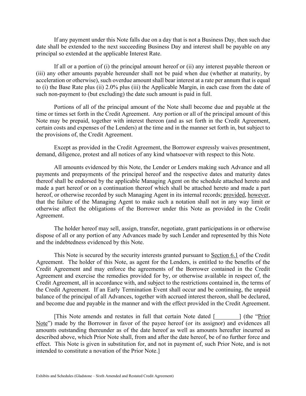 Exhibits and Schedules (Gladstone – Sixth Amended and Restated Credit Agreement) If any payment under this Note falls due on a day that is not a Business Day, then such due date shall be extended to the next succeeding Business Day and interest shall be payable on any principal so extended at the applicable Interest Rate. If all or a portion of (i) the principal amount hereof or (ii) any interest payable thereon or (iii) any other amounts payable hereunder shall not be paid when due (whether at maturity, by acceleration or otherwise), such overdue amount shall bear interest at a rate per annum that is equal to (i) the Base Rate plus (ii) 2.0% plus (iii) the Applicable Margin, in each case from the date of such non-payment to (but excluding) the date such amount is paid in full. Portions of all of the principal amount of the Note shall become due and payable at the time or times set forth in the Credit Agreement. Any portion or all of the principal amount of this Note may be prepaid, together with interest thereon (and as set forth in the Credit Agreement, certain costs and expenses of the Lenders) at the time and in the manner set forth in, but subject to the provisions of, the Credit Agreement. Except as provided in the Credit Agreement, the Borrower expressly waives presentment, demand, diligence, protest and all notices of any kind whatsoever with respect to this Note. All amounts evidenced by this Note, the Lender or Lenders making such Advance and all payments and prepayments of the principal hereof and the respective dates and maturity dates thereof shall be endorsed by the applicable Managing Agent on the schedule attached hereto and made a part hereof or on a continuation thereof which shall be attached hereto and made a part hereof, or otherwise recorded by such Managing Agent in its internal records; provided, however, that the failure of the Managing Agent to make such a notation shall not in any way limit or otherwise affect the obligations of the Borrower under this Note as provided in the Credit Agreement. The holder hereof may sell, assign, transfer, negotiate, grant participations in or otherwise dispose of all or any portion of any Advances made by such Lender and represented by this Note and the indebtedness evidenced by this Note. This Note is secured by the security interests granted pursuant to Section 6.1 of the Credit Agreement. The holder of this Note, as agent for the Lenders, is entitled to the benefits of the Credit Agreement and may enforce the agreements of the Borrower contained in the Credit Agreement and exercise the remedies provided for by, or otherwise available in respect of, the Credit Agreement, all in accordance with, and subject to the restrictions contained in, the terms of the Credit Agreement. If an Early Termination Event shall occur and be continuing, the unpaid balance of the principal of all Advances, together with accrued interest thereon, shall be declared, and become due and payable in the manner and with the effect provided in the Credit Agreement. [This Note amends and restates in full that certain Note dated [________] (the “Prior Note”) made by the Borrower in favor of the payee hereof (or its assignor) and evidences all amounts outstanding thereunder as of the date hereof as well as amounts hereafter incurred as described above, which Prior Note shall, from and after the date hereof, be of no further force and effect. This Note is given in substitution for, and not in payment of, such Prior Note, and is not intended to constitute a novation of the Prior Note.]