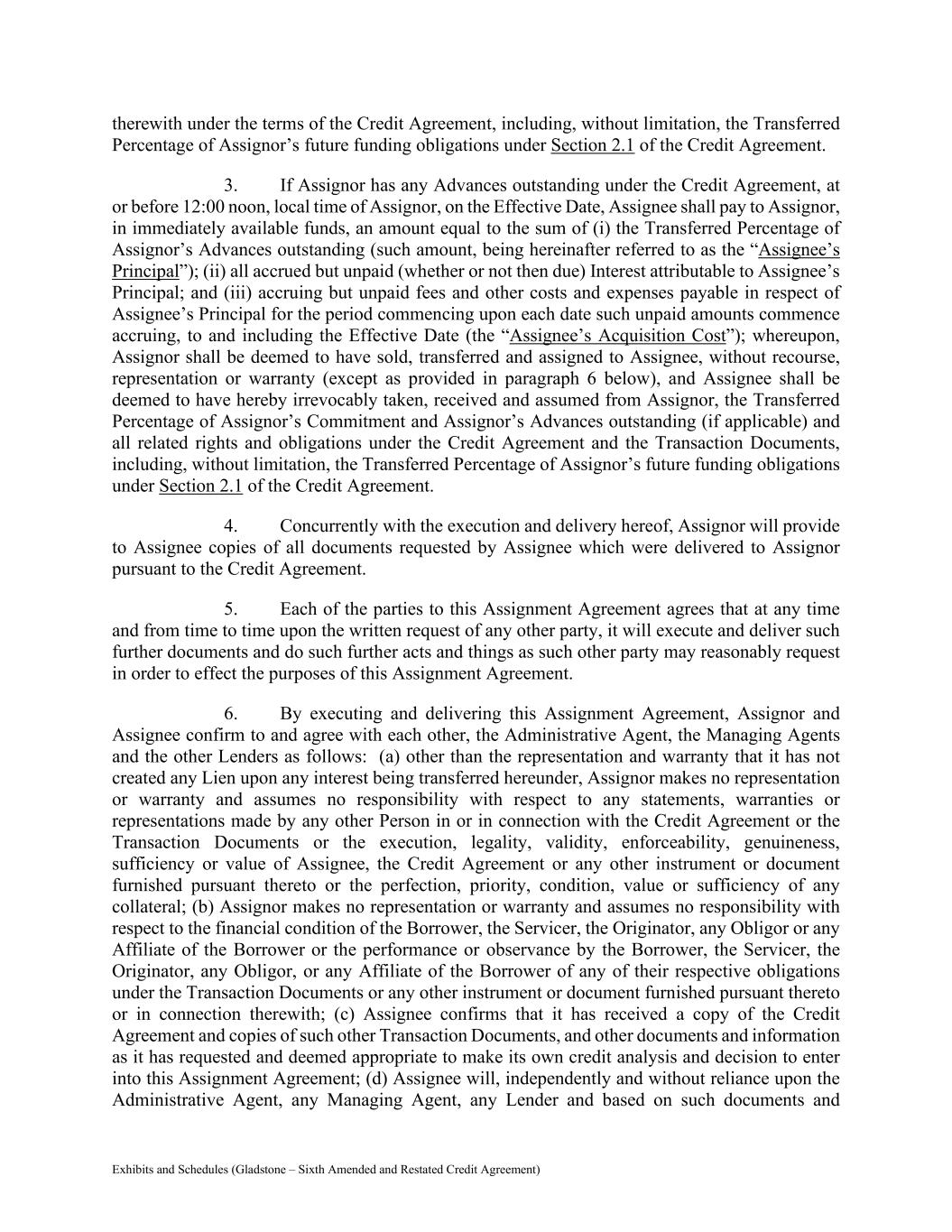 Exhibits and Schedules (Gladstone – Sixth Amended and Restated Credit Agreement) therewith under the terms of the Credit Agreement, including, without limitation, the Transferred Percentage of Assignor’s future funding obligations under Section 2.1 of the Credit Agreement. 3. If Assignor has any Advances outstanding under the Credit Agreement, at or before 12:00 noon, local time of Assignor, on the Effective Date, Assignee shall pay to Assignor, in immediately available funds, an amount equal to the sum of (i) the Transferred Percentage of Assignor’s Advances outstanding (such amount, being hereinafter referred to as the “Assignee’s Principal”); (ii) all accrued but unpaid (whether or not then due) Interest attributable to Assignee’s Principal; and (iii) accruing but unpaid fees and other costs and expenses payable in respect of Assignee’s Principal for the period commencing upon each date such unpaid amounts commence accruing, to and including the Effective Date (the “Assignee’s Acquisition Cost”); whereupon, Assignor shall be deemed to have sold, transferred and assigned to Assignee, without recourse, representation or warranty (except as provided in paragraph 6 below), and Assignee shall be deemed to have hereby irrevocably taken, received and assumed from Assignor, the Transferred Percentage of Assignor’s Commitment and Assignor’s Advances outstanding (if applicable) and all related rights and obligations under the Credit Agreement and the Transaction Documents, including, without limitation, the Transferred Percentage of Assignor’s future funding obligations under Section 2.1 of the Credit Agreement. 4. Concurrently with the execution and delivery hereof, Assignor will provide to Assignee copies of all documents requested by Assignee which were delivered to Assignor pursuant to the Credit Agreement. 5. Each of the parties to this Assignment Agreement agrees that at any time and from time to time upon the written request of any other party, it will execute and deliver such further documents and do such further acts and things as such other party may reasonably request in order to effect the purposes of this Assignment Agreement. 6. By executing and delivering this Assignment Agreement, Assignor and Assignee confirm to and agree with each other, the Administrative Agent, the Managing Agents and the other Lenders as follows: (a) other than the representation and warranty that it has not created any Lien upon any interest being transferred hereunder, Assignor makes no representation or warranty and assumes no responsibility with respect to any statements, warranties or representations made by any other Person in or in connection with the Credit Agreement or the Transaction Documents or the execution, legality, validity, enforceability, genuineness, sufficiency or value of Assignee, the Credit Agreement or any other instrument or document furnished pursuant thereto or the perfection, priority, condition, value or sufficiency of any collateral; (b) Assignor makes no representation or warranty and assumes no responsibility with respect to the financial condition of the Borrower, the Servicer, the Originator, any Obligor or any Affiliate of the Borrower or the performance or observance by the Borrower, the Servicer, the Originator, any Obligor, or any Affiliate of the Borrower of any of their respective obligations under the Transaction Documents or any other instrument or document furnished pursuant thereto or in connection therewith; (c) Assignee confirms that it has received a copy of the Credit Agreement and copies of such other Transaction Documents, and other documents and information as it has requested and deemed appropriate to make its own credit analysis and decision to enter into this Assignment Agreement; (d) Assignee will, independently and without reliance upon the Administrative Agent, any Managing Agent, any Lender and based on such documents and
