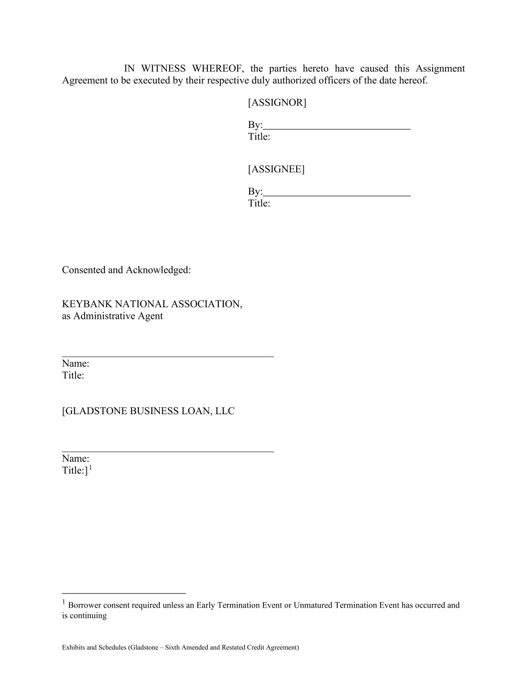 Exhibits and Schedules (Gladstone – Sixth Amended and Restated Credit Agreement) IN WITNESS WHEREOF, the parties hereto have caused this Assignment Agreement to be executed by their respective duly authorized officers of the date hereof. [ASSIGNOR] By: Title: [ASSIGNEE] By: Title: Consented and Acknowledged: KEYBANK NATIONAL ASSOCIATION, as Administrative Agent _________________________________________ Name: Title: [GLADSTONE BUSINESS LOAN, LLC _________________________________________ Name: Title:]0F 1 1 Borrower consent required unless an Early Termination Event or Unmatured Termination Event has occurred and is continuing