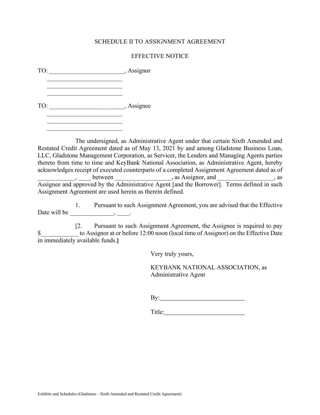 Exhibits and Schedules (Gladstone – Sixth Amended and Restated Credit Agreement) SCHEDULE II TO ASSIGNMENT AGREEMENT EFFECTIVE NOTICE TO: ________________________, Assignor ________________________ ________________________ ________________________ TO: ________________________, Assignee ________________________ ________________________ ________________________ The undersigned, as Administrative Agent under that certain Sixth Amended and Restated Credit Agreement dated as of May 13, 2021 by and among Gladstone Business Loan, LLC, Gladstone Management Corporation, as Servicer, the Lenders and Managing Agents parties thereto from time to time and KeyBank National Association, as Administrative Agent, hereby acknowledges receipt of executed counterparts of a completed Assignment Agreement dated as of ____________, ____ between __________________, as Assignor, and __________________, as Assignee and approved by the Administrative Agent [and the Borrower]. Terms defined in such Assignment Agreement are used herein as therein defined. 1. Pursuant to such Assignment Agreement, you are advised that the Effective Date will be ______________, ____. [2. Pursuant to such Assignment Agreement, the Assignee is required to pay $____________ to Assignor at or before 12:00 noon (local time of Assignor) on the Effective Date in immediately available funds.] Very truly yours, KEYBANK NATIONAL ASSOCIATION, as Administrative Agent By: Title: