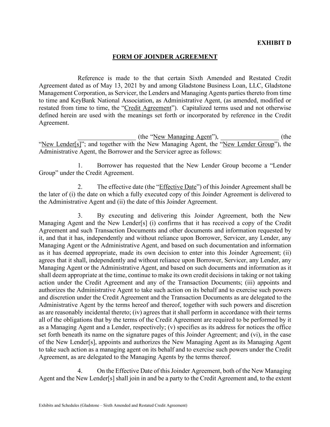 Exhibits and Schedules (Gladstone – Sixth Amended and Restated Credit Agreement) EXHIBIT D FORM OF JOINDER AGREEMENT Reference is made to the that certain Sixth Amended and Restated Credit Agreement dated as of May 13, 2021 by and among Gladstone Business Loan, LLC, Gladstone Management Corporation, as Servicer, the Lenders and Managing Agents parties thereto from time to time and KeyBank National Association, as Administrative Agent, (as amended, modified or restated from time to time, the “Credit Agreement”). Capitalized terms used and not otherwise defined herein are used with the meanings set forth or incorporated by reference in the Credit Agreement. __________________ (the “New Managing Agent”), __________________ (the “New Lender[s]”; and together with the New Managing Agent, the “New Lender Group”), the Administrative Agent, the Borrower and the Servicer agree as follows: 1. Borrower has requested that the New Lender Group become a “Lender Group” under the Credit Agreement. 2. The effective date (the “Effective Date”) of this Joinder Agreement shall be the later of (i) the date on which a fully executed copy of this Joinder Agreement is delivered to the Administrative Agent and (ii) the date of this Joinder Agreement. 3. By executing and delivering this Joinder Agreement, both the New Managing Agent and the New Lender[s] (i) confirms that it has received a copy of the Credit Agreement and such Transaction Documents and other documents and information requested by it, and that it has, independently and without reliance upon Borrower, Servicer, any Lender, any Managing Agent or the Administrative Agent, and based on such documentation and information as it has deemed appropriate, made its own decision to enter into this Joinder Agreement; (ii) agrees that it shall, independently and without reliance upon Borrower, Servicer, any Lender, any Managing Agent or the Administrative Agent, and based on such documents and information as it shall deem appropriate at the time, continue to make its own credit decisions in taking or not taking action under the Credit Agreement and any of the Transaction Documents; (iii) appoints and authorizes the Administrative Agent to take such action on its behalf and to exercise such powers and discretion under the Credit Agreement and the Transaction Documents as are delegated to the Administrative Agent by the terms hereof and thereof, together with such powers and discretion as are reasonably incidental thereto; (iv) agrees that it shall perform in accordance with their terms all of the obligations that by the terms of the Credit Agreement are required to be performed by it as a Managing Agent and a Lender, respectively; (v) specifies as its address for notices the office set forth beneath its name on the signature pages of this Joinder Agreement; and (vi), in the case of the New Lender[s], appoints and authorizes the New Managing Agent as its Managing Agent to take such action as a managing agent on its behalf and to exercise such powers under the Credit Agreement, as are delegated to the Managing Agents by the terms thereof. 4. On the Effective Date of this Joinder Agreement, both of the New Managing Agent and the New Lender[s] shall join in and be a party to the Credit Agreement and, to the extent