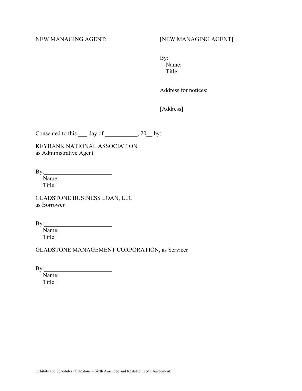 Exhibits and Schedules (Gladstone – Sixth Amended and Restated Credit Agreement) NEW MANAGING AGENT: [NEW MANAGING AGENT] By:_______________________ Name: Title: Address for notices: [Address] Consented to this ___ day of ___________, 20__ by: KEYBANK NATIONAL ASSOCIATION as Administrative Agent By:_______________________ Name: Title: GLADSTONE BUSINESS LOAN, LLC as Borrower By:_______________________ Name: Title: GLADSTONE MANAGEMENT CORPORATION, as Servicer By:_______________________ Name: Title: