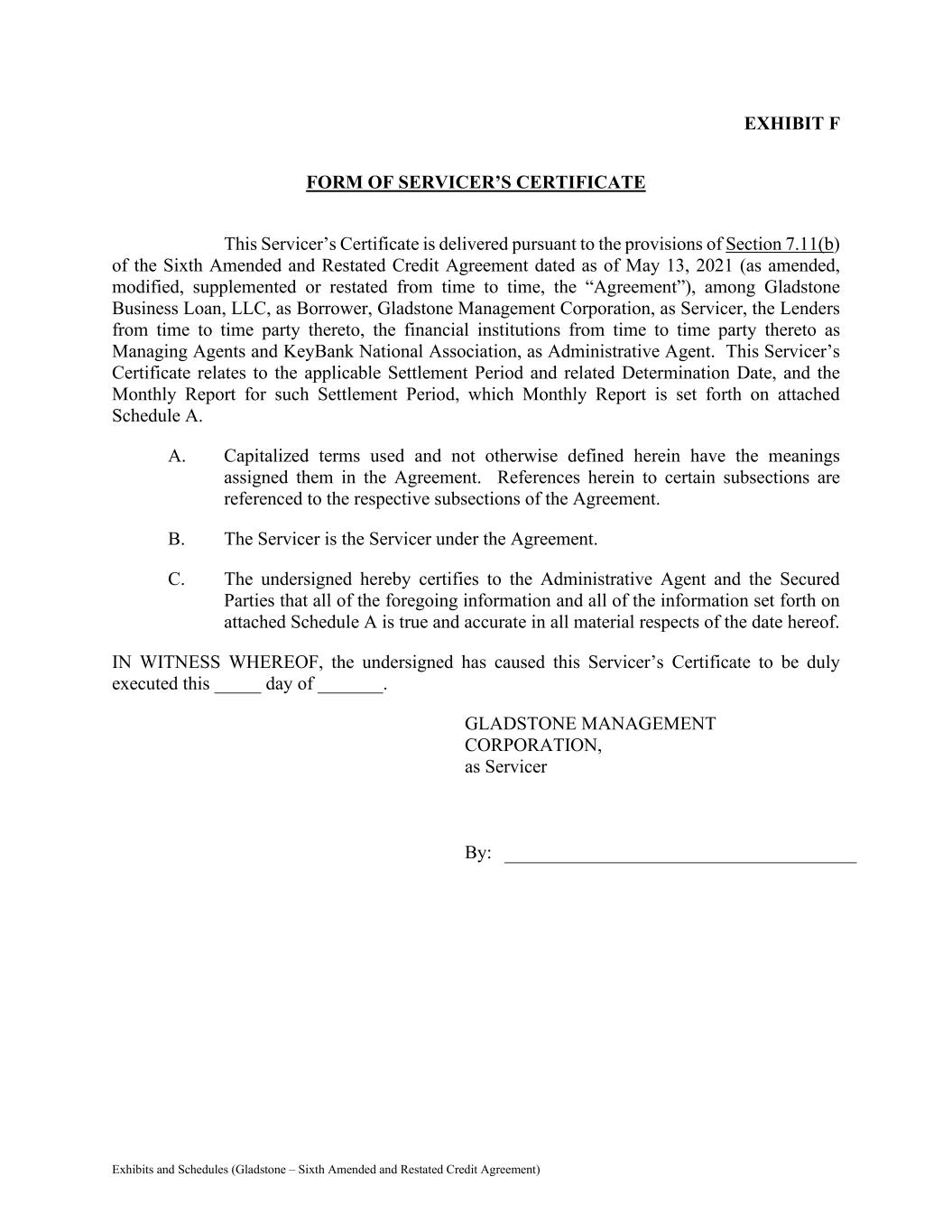 Exhibits and Schedules (Gladstone – Sixth Amended and Restated Credit Agreement) EXHIBIT F FORM OF SERVICER’S CERTIFICATE This Servicer’s Certificate is delivered pursuant to the provisions of Section 7.11(b) of the Sixth Amended and Restated Credit Agreement dated as of May 13, 2021 (as amended, modified, supplemented or restated from time to time, the “Agreement”), among Gladstone Business Loan, LLC, as Borrower, Gladstone Management Corporation, as Servicer, the Lenders from time to time party thereto, the financial institutions from time to time party thereto as Managing Agents and KeyBank National Association, as Administrative Agent. This Servicer’s Certificate relates to the applicable Settlement Period and related Determination Date, and the Monthly Report for such Settlement Period, which Monthly Report is set forth on attached Schedule A. A. Capitalized terms used and not otherwise defined herein have the meanings assigned them in the Agreement. References herein to certain subsections are referenced to the respective subsections of the Agreement. B. The Servicer is the Servicer under the Agreement. C. The undersigned hereby certifies to the Administrative Agent and the Secured Parties that all of the foregoing information and all of the information set forth on attached Schedule A is true and accurate in all material respects of the date hereof. IN WITNESS WHEREOF, the undersigned has caused this Servicer’s Certificate to be duly executed this _____ day of _______. GLADSTONE MANAGEMENT CORPORATION, as Servicer By:
