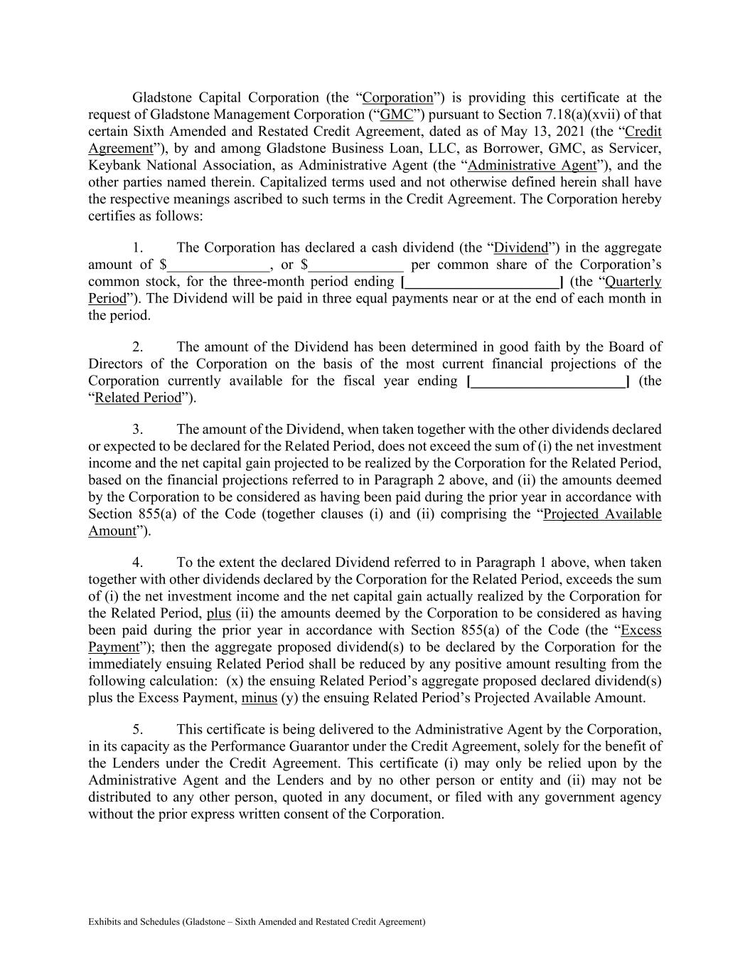 Exhibits and Schedules (Gladstone – Sixth Amended and Restated Credit Agreement) Gladstone Capital Corporation (the “Corporation”) is providing this certificate at the request of Gladstone Management Corporation (“GMC”) pursuant to Section 7.18(a)(xvii) of that certain Sixth Amended and Restated Credit Agreement, dated as of May 13, 2021 (the “Credit Agreement”), by and among Gladstone Business Loan, LLC, as Borrower, GMC, as Servicer, Keybank National Association, as Administrative Agent (the “Administrative Agent”), and the other parties named therein. Capitalized terms used and not otherwise defined herein shall have the respective meanings ascribed to such terms in the Credit Agreement. The Corporation hereby certifies as follows: 1. The Corporation has declared a cash dividend (the “Dividend”) in the aggregate amount of $______________, or $_____________ per common share of the Corporation’s common stock, for the three-month period ending [_____________________] (the “Quarterly Period”). The Dividend will be paid in three equal payments near or at the end of each month in the period. 2. The amount of the Dividend has been determined in good faith by the Board of Directors of the Corporation on the basis of the most current financial projections of the Corporation currently available for the fiscal year ending [_____________________] (the “Related Period”). 3. The amount of the Dividend, when taken together with the other dividends declared or expected to be declared for the Related Period, does not exceed the sum of (i) the net investment income and the net capital gain projected to be realized by the Corporation for the Related Period, based on the financial projections referred to in Paragraph 2 above, and (ii) the amounts deemed by the Corporation to be considered as having been paid during the prior year in accordance with Section 855(a) of the Code (together clauses (i) and (ii) comprising the “Projected Available Amount”). 4. To the extent the declared Dividend referred to in Paragraph 1 above, when taken together with other dividends declared by the Corporation for the Related Period, exceeds the sum of (i) the net investment income and the net capital gain actually realized by the Corporation for the Related Period, plus (ii) the amounts deemed by the Corporation to be considered as having been paid during the prior year in accordance with Section 855(a) of the Code (the “Excess Payment”); then the aggregate proposed dividend(s) to be declared by the Corporation for the immediately ensuing Related Period shall be reduced by any positive amount resulting from the following calculation: (x) the ensuing Related Period’s aggregate proposed declared dividend(s) plus the Excess Payment, minus (y) the ensuing Related Period’s Projected Available Amount. 5. This certificate is being delivered to the Administrative Agent by the Corporation, in its capacity as the Performance Guarantor under the Credit Agreement, solely for the benefit of the Lenders under the Credit Agreement. This certificate (i) may only be relied upon by the Administrative Agent and the Lenders and by no other person or entity and (ii) may not be distributed to any other person, quoted in any document, or filed with any government agency without the prior express written consent of the Corporation.
