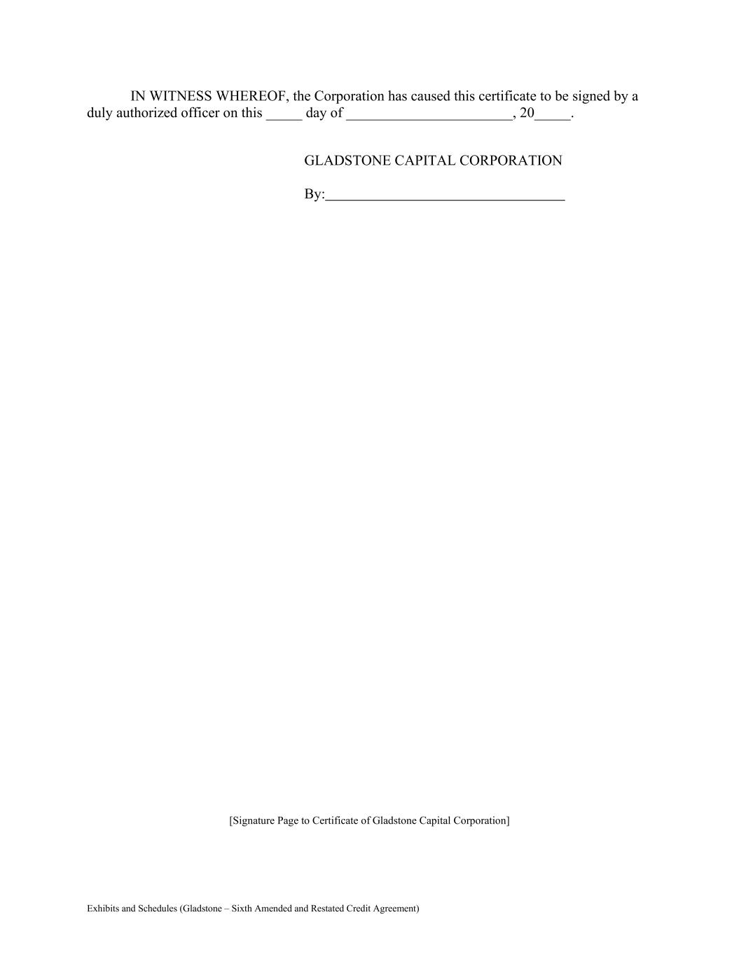 Exhibits and Schedules (Gladstone – Sixth Amended and Restated Credit Agreement) IN WITNESS WHEREOF, the Corporation has caused this certificate to be signed by a duly authorized officer on this _____ day of _______________________, 20_____. GLADSTONE CAPITAL CORPORATION By: [Signature Page to Certificate of Gladstone Capital Corporation]
