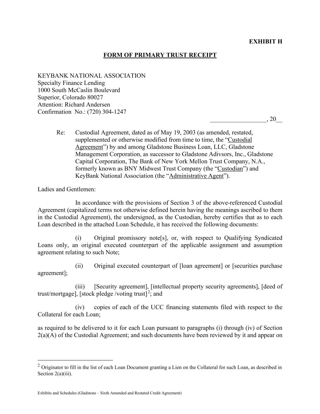 Exhibits and Schedules (Gladstone – Sixth Amended and Restated Credit Agreement) EXHIBIT H FORM OF PRIMARY TRUST RECEIPT KEYBANK NATIONAL ASSOCIATION Specialty Finance Lending 1000 South McCaslin Boulevard Superior, Colorado 80027 Attention: Richard Andersen Confirmation No.: (720) 304-1247 __________________, 20__ Re: Custodial Agreement, dated as of May 19, 2003 (as amended, restated, supplemented or otherwise modified from time to time, the “Custodial Agreement”) by and among Gladstone Business Loan, LLC, Gladstone Management Corporation, as successor to Gladstone Adivsors, Inc., Gladstone Capital Corporation, The Bank of New York Mellon Trust Company, N.A., formerly known as BNY Midwest Trust Company (the “Custodian”) and KeyBank National Association (the “Administrative Agent”). Ladies and Gentlemen: In accordance with the provisions of Section 3 of the above-referenced Custodial Agreement (capitalized terms not otherwise defined herein having the meanings ascribed to them in the Custodial Agreement), the undersigned, as the Custodian, hereby certifies that as to each Loan described in the attached Loan Schedule, it has received the following documents: (i) Original promissory note[s], or, with respect to Qualifying Syndicated Loans only, an original executed counterpart of the applicable assignment and assumption agreement relating to such Note; (ii) Original executed counterpart of [loan agreement] or [securities purchase agreement]; (iii) [Security agreement], [intellectual property security agreements], [deed of trust/mortgage], [stock pledge /voting trust]1F 2; and (iv) copies of each of the UCC financing statements filed with respect to the Collateral for each Loan; as required to be delivered to it for each Loan pursuant to paragraphs (i) through (iv) of Section 2(a)(A) of the Custodial Agreement; and such documents have been reviewed by it and appear on 2 Originator to fill in the list of each Loan Document granting a Lien on the Collateral for such Loan, as described in Section 2(a)(iii).